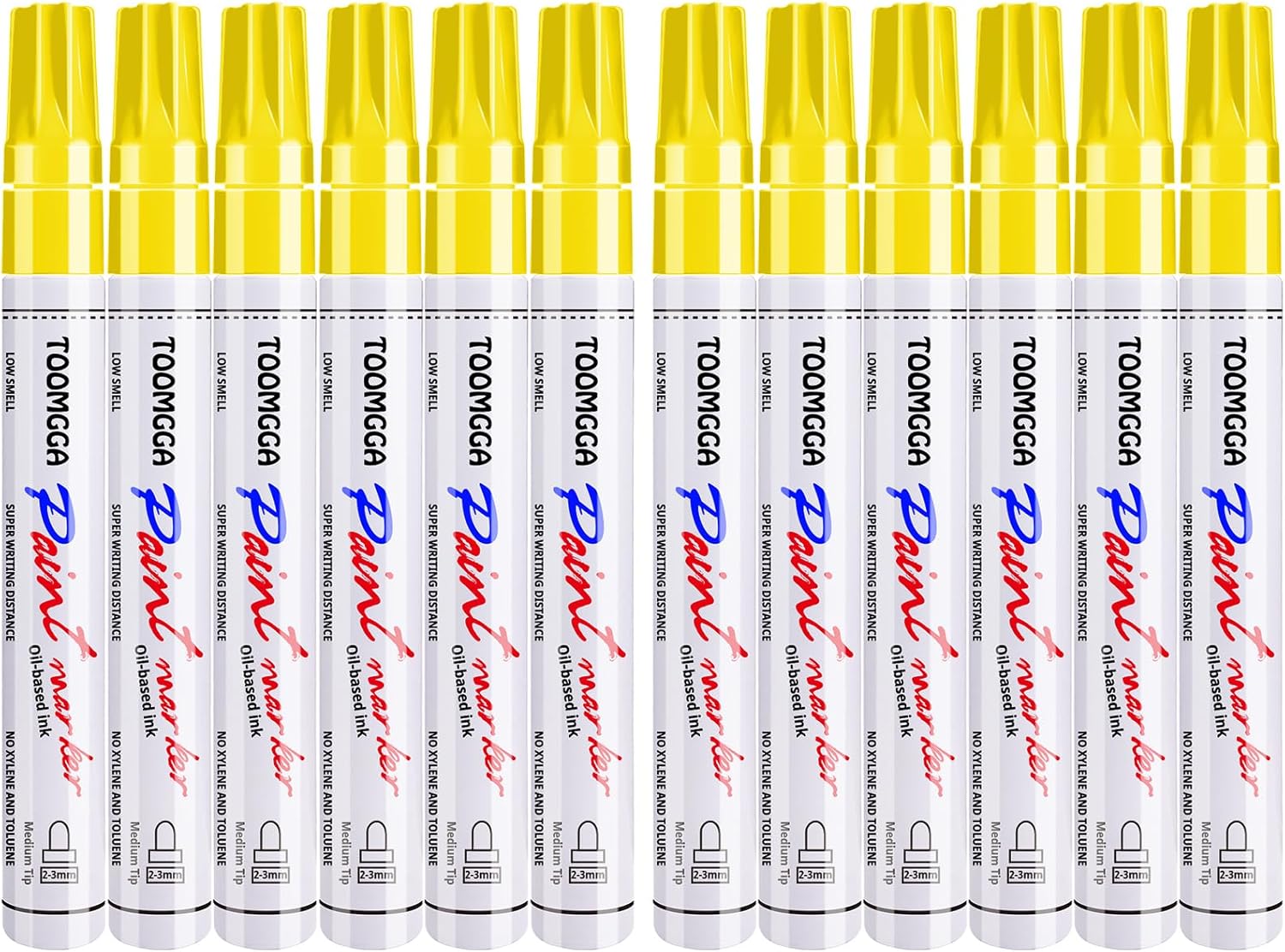 Yellow Permanent Paint Pens Paint Markers - 12 Pack Oil Based Markers, Quick Drying and Waterproof Marker Pen, Car Tire, Metal, Rock Painting, Wood, Ceramic, Plastic, Canvas, Mugs, Medium Tip