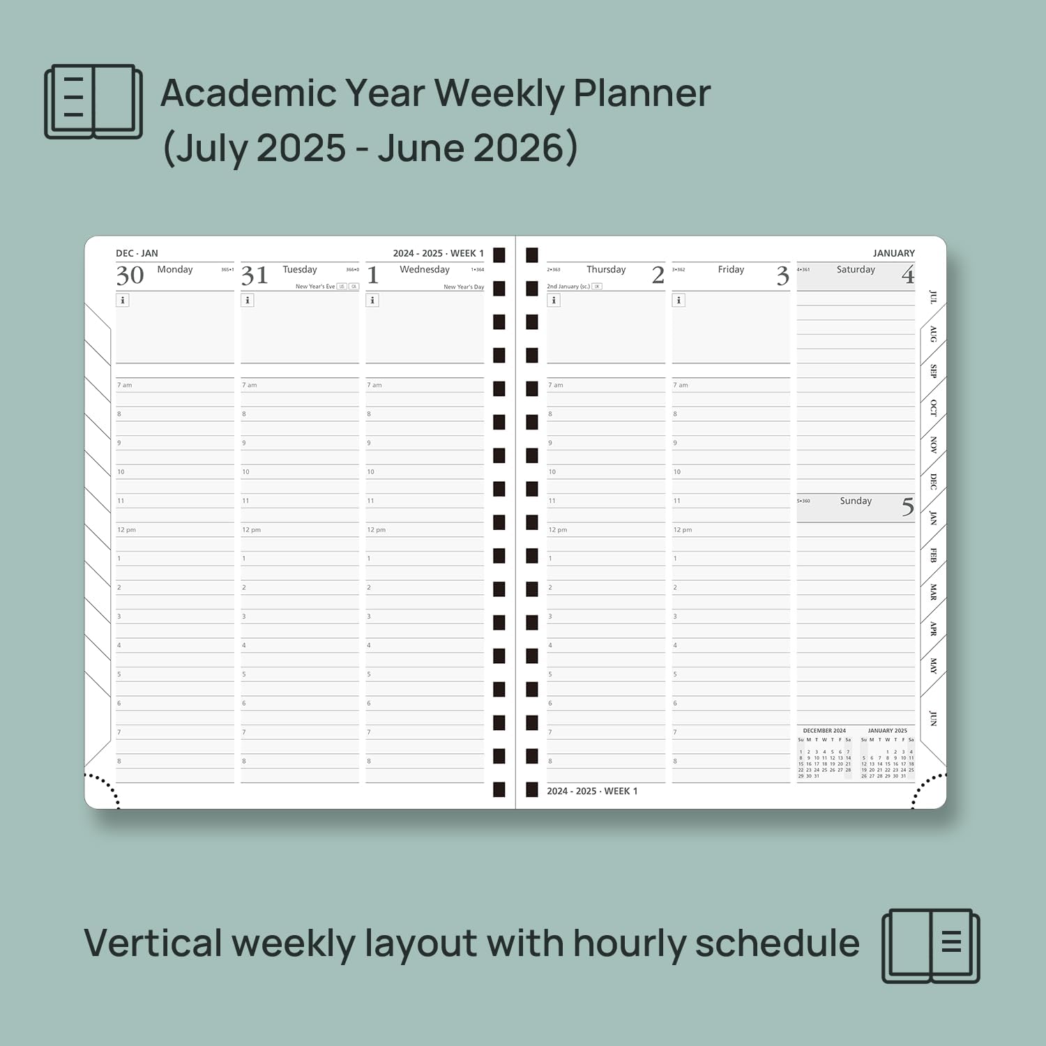 POPRUN Planner 2025-2026 (Medium - 6.5'' x 8.5'') Academic Weekly Calendar (July 2025 - June 2026) with Hourly Time Slots, Monthly Tabs, 100GSM Thick Papers, Spiral Leather Cover - Green