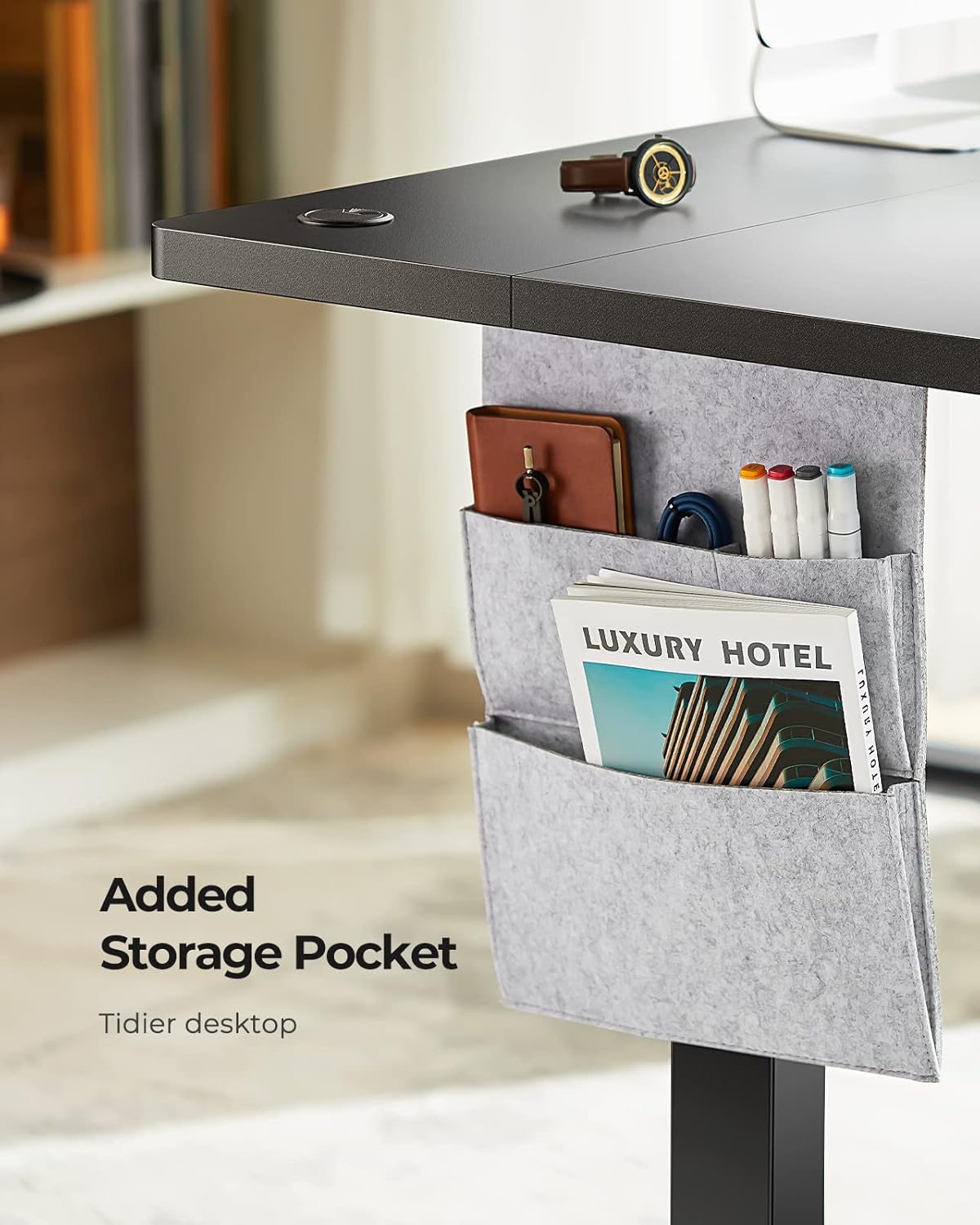 - Multifunctional Side Storage Pocket: The adjustable desk stay organized with Marsail’s double-layered side storage pocket, designed to hold folders, notebooks, and office supplies without taking up valuable desk space. This pocket keeps your essentials within easy reach, reducing clutter and boosting focus and productivity. Its seamless design integrates perfectly with the desk's aesthetic.