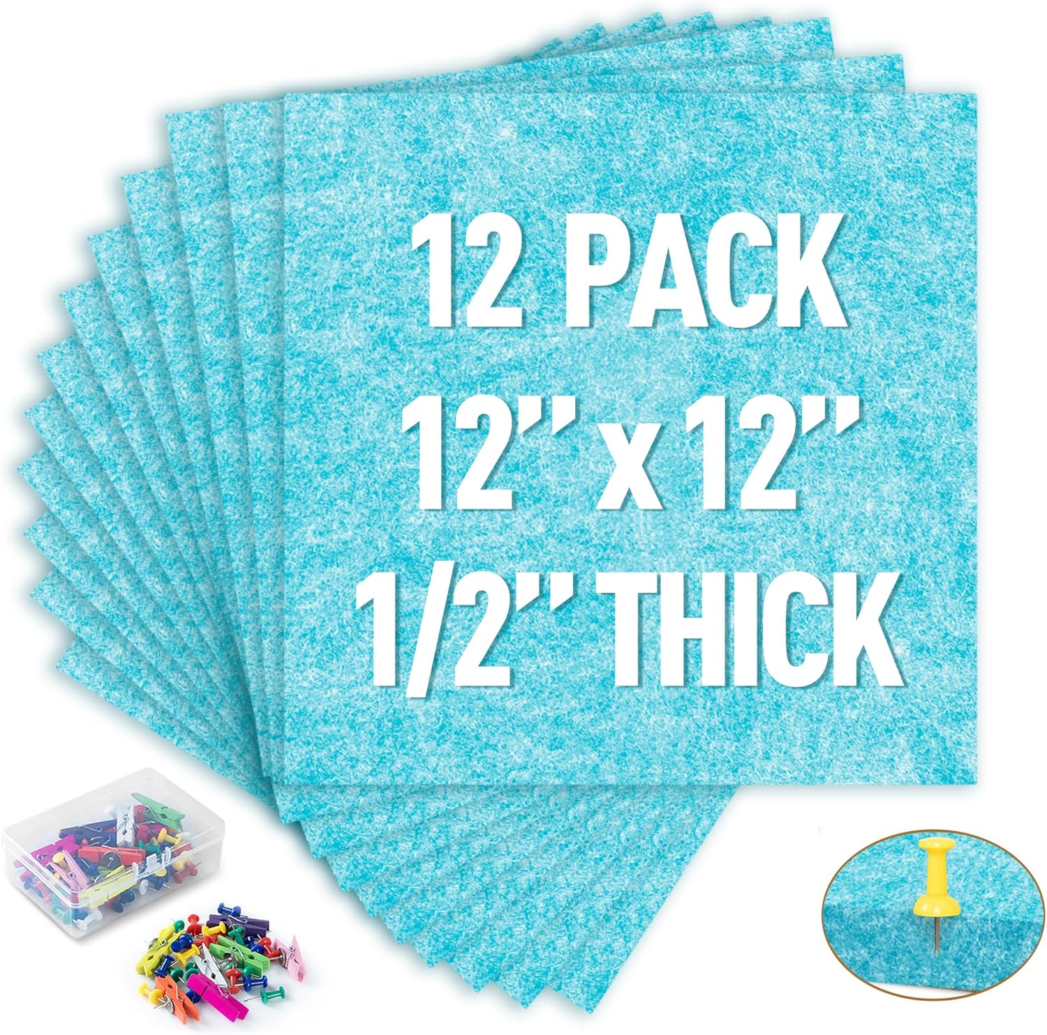 AKTOP Cork Bulletin Board 12x12, 1/2" Thick Felt Cork Board Tiles 12 Pack, Small Square Pin Board for Wall, Self Adhesive Corkboards with 120 Push Pin Wood Clips for School, Home & Office, Baby Blue
