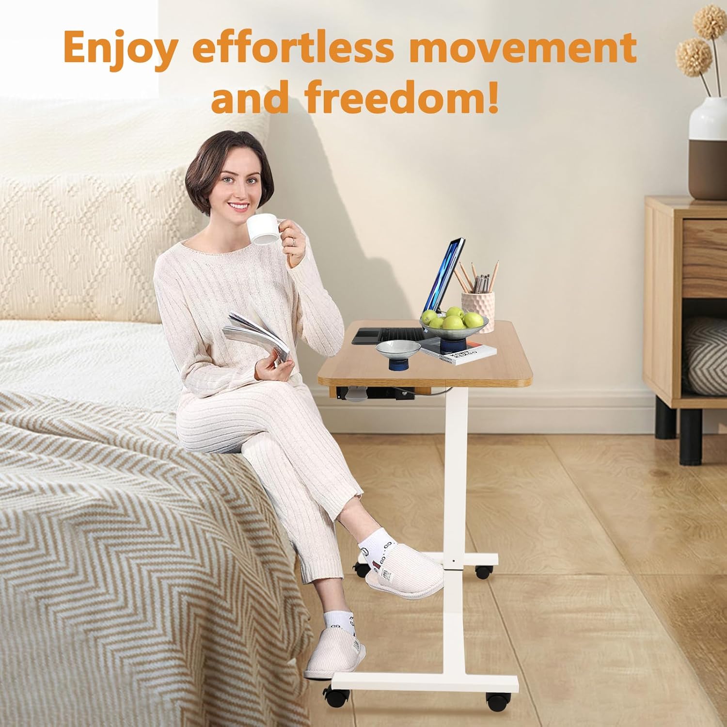 CLATINA Mobile Laptop Standing Desk, Height Adjustable Teacher Podium with Lockable Wheels, Adjustable Work Table with Drawer, Computer Cart Overbed Table for Home Office Classroom, Beige