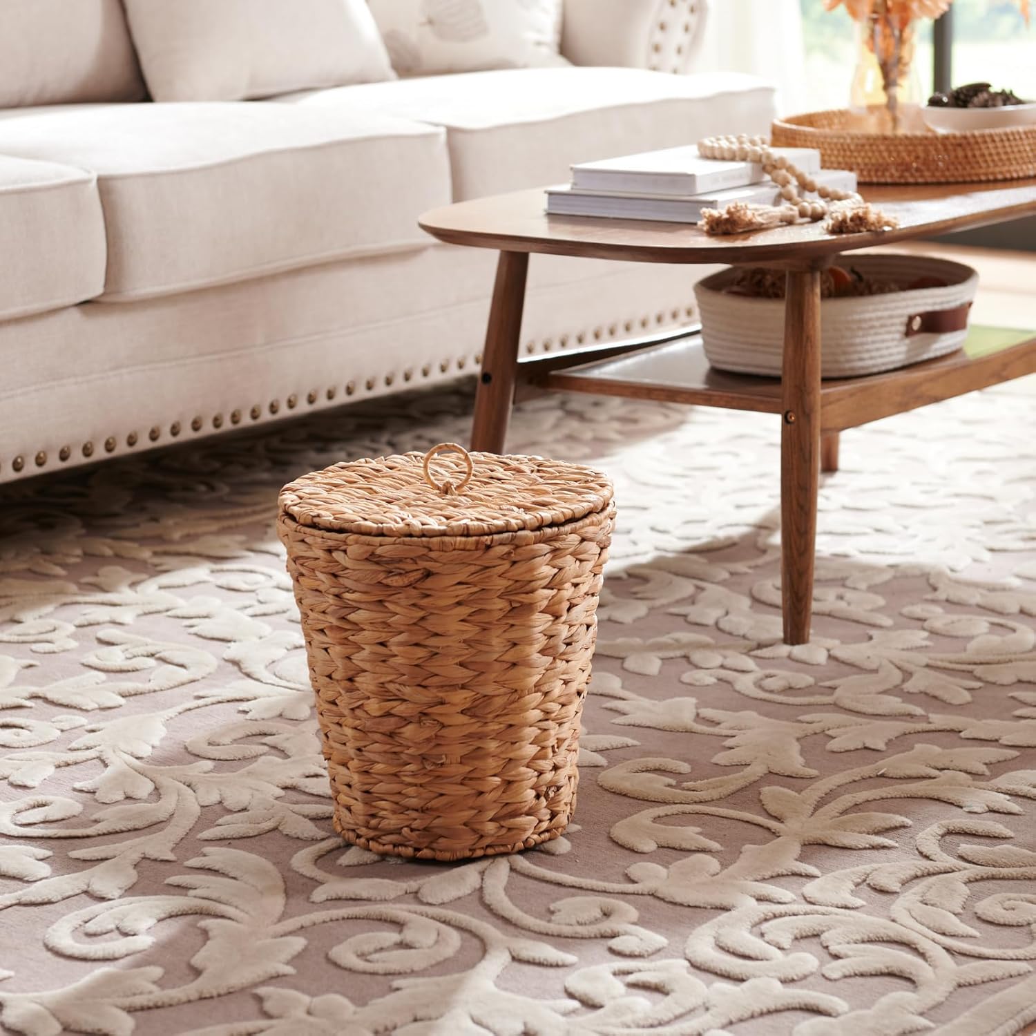 - Natural Material: Carefully handwoven from FSC-Certified water hyacinth fiber, this wicker trash basket adds an eco-friendly charm to your space, seamlessly blending sustainability with everyday functionality.