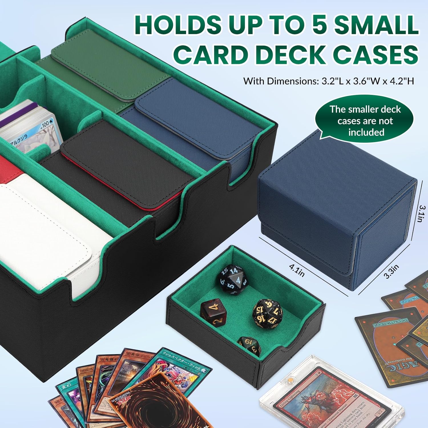 Leather Magnetic Card Storage Box for Trading Cards, Holds 5 MTG Deck Boxes, with 13 Dividers & Dice Tray