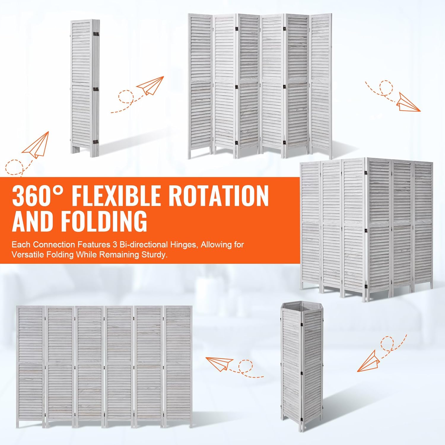 - Flexible 360° Movement: Each room divider panel connects with three sturdy double-directional hinges, allowing you to rotate and fold at any angle. When not using it, fold it and tuck it away in a corner. For added stability, arrange it in a zigzag pattern to keep it from tipping over when fully extended.