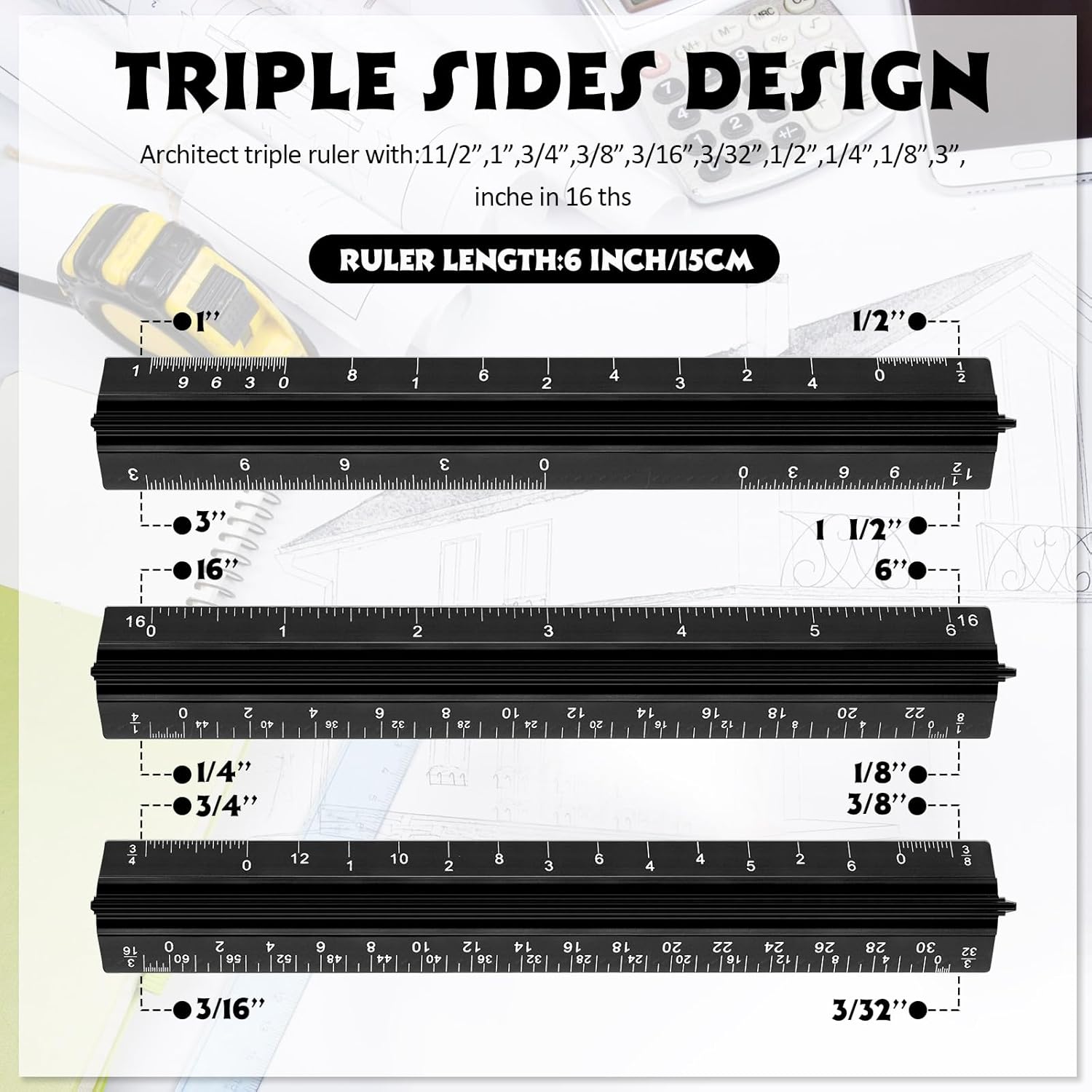 - Versatile Imperial Scale Options: features a range of imperial measurements, including 1-1/2, 1, 3/4, 3/8, 3/16, 3/32, 1/2, 1/4, 1/8, and 3, making this architectural ruler a practical tool for architects, engineers, and artists requiring accurate measurements