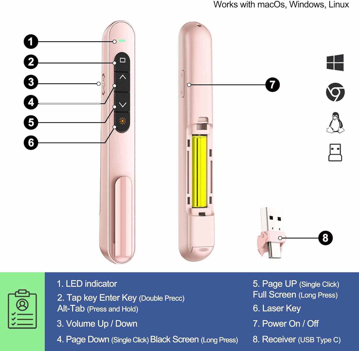- 【PLUG & PLAY PRESENTATION CLICKER】The intuitive touch buttons of this presenter clicker integrate hyperlink navigation, page up/down, volume control, power switch, and full screen/black screen functions. No software is required, just connect the magnetic 2.4 GHz USB receiver at the bottom of the clicker to your computer and it's ready to use. (Powered by 1 AAA Battery is not included)
