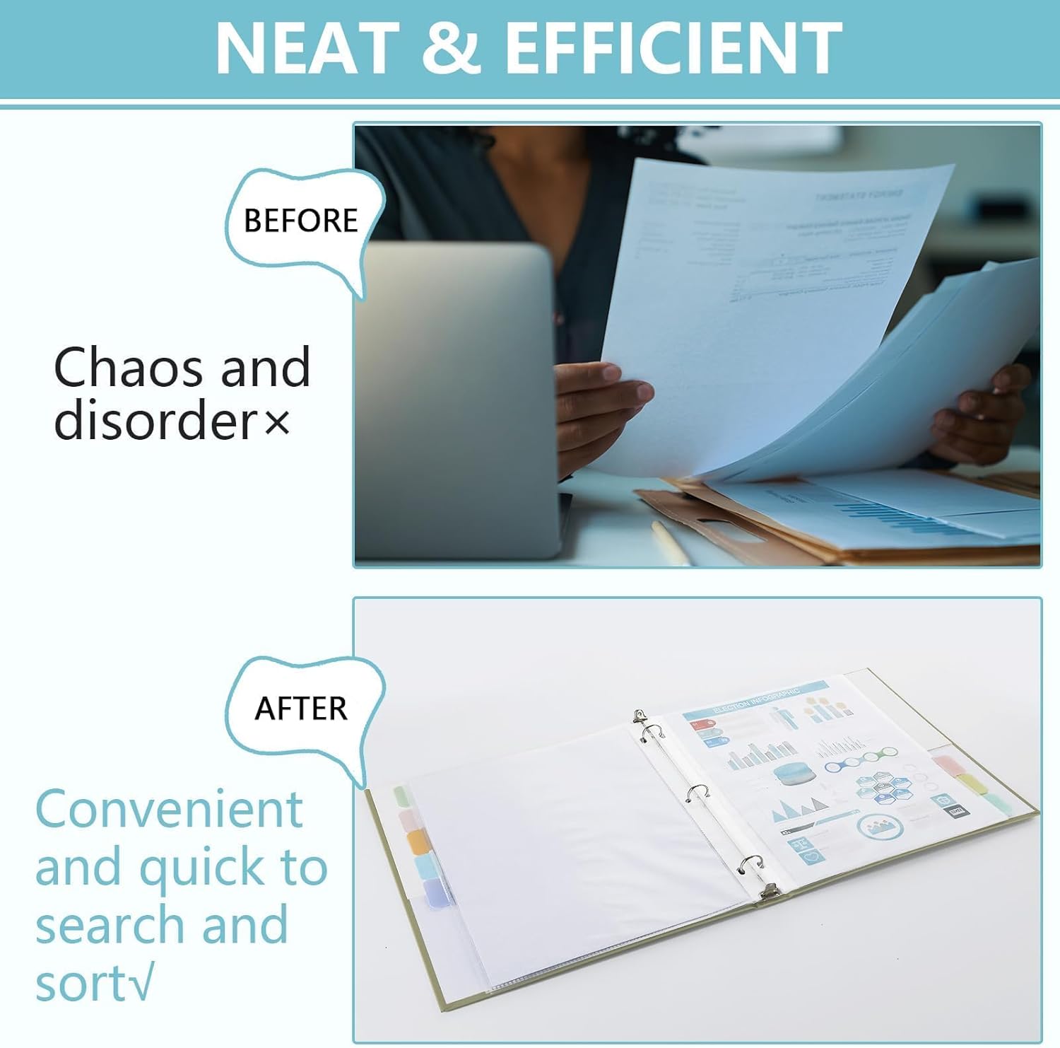 - Versatile applications for all your needs: Whether you're storing notes, reports, or other important documents, these tabbed 3 ring binder sheet protectors protect against damage and stains. Ideal for preserving files, recipes, photos, certificates, organizing homework, customer information, classified documents, recipes, custom presentations, reference materials, and personal documents with ease.