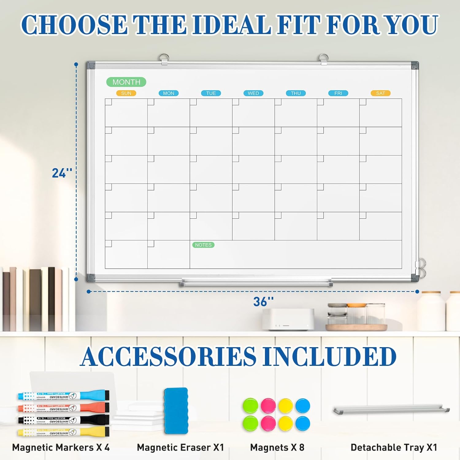 - 【All-inclusive Accessory Kit】Everything you need is included in the 36x24 inches calendar set—4 colours dry erase markers, 8 magnets, 1 eraser, a movable tray, hanging hooks and wall mounted screw kit. Start organizing your schedule immediately with no extra purchases required.