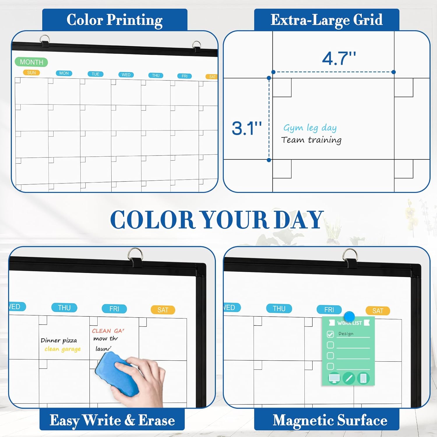 - 【Smooth Writing & Reusable Surface】Write and wipe with ease on this clear, color-printed calendar surface. The colorful printed design adds vibrancy and makes your planning experience more enjoyable. The stain-resistant and waterproof layers make writing smooth and cleaning hassle-free, keeping your calendar white board fresh and reusable for long-term use.