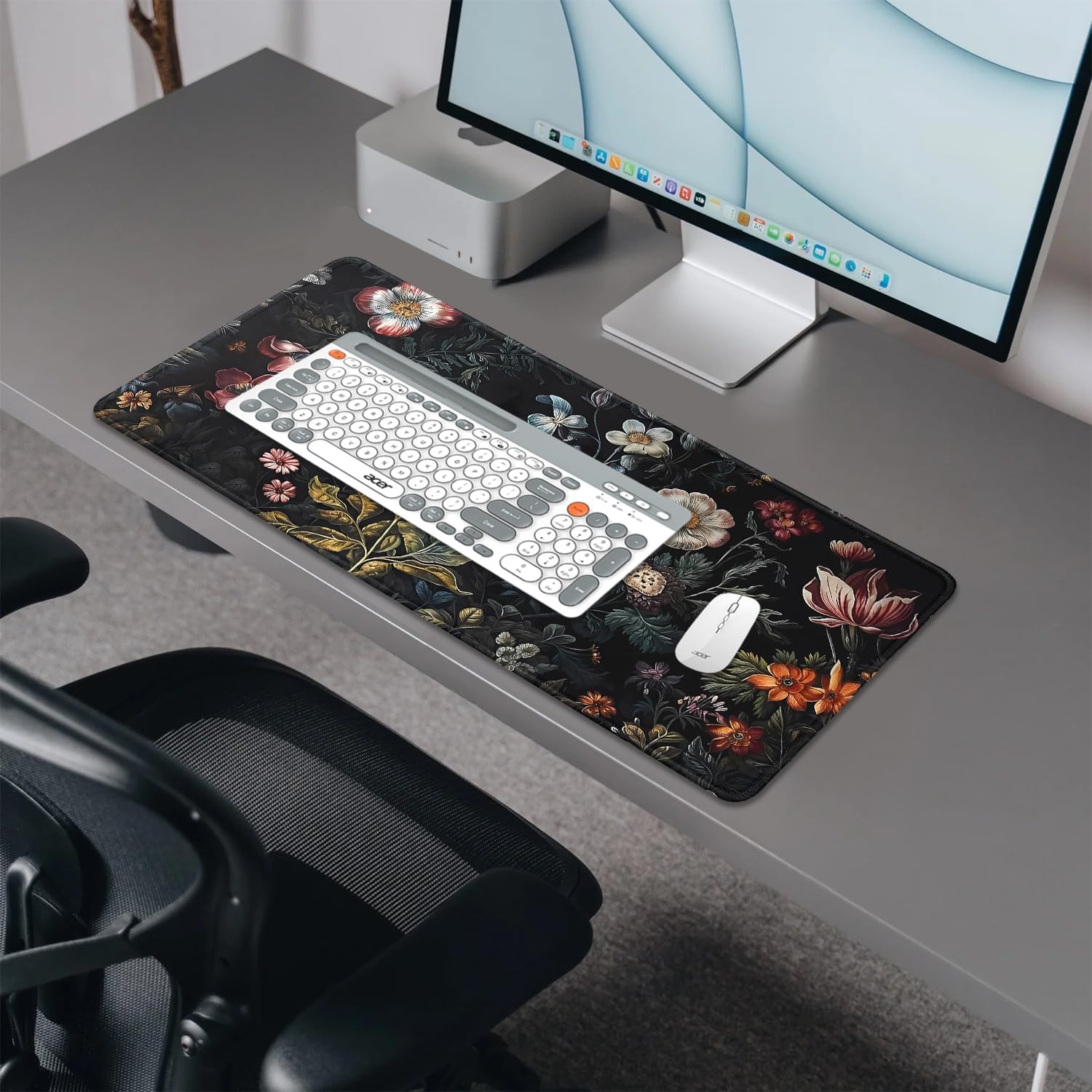 Vintage Aesthetic Mouse Pad,Extended Flower Plant Black Mousepad Desk Pad with Stitched Edges,Non-Slip Waterproof Rubber Base Mouse Mat for Office Computer Keyboard Laptop Home(27.5x11.8 in)