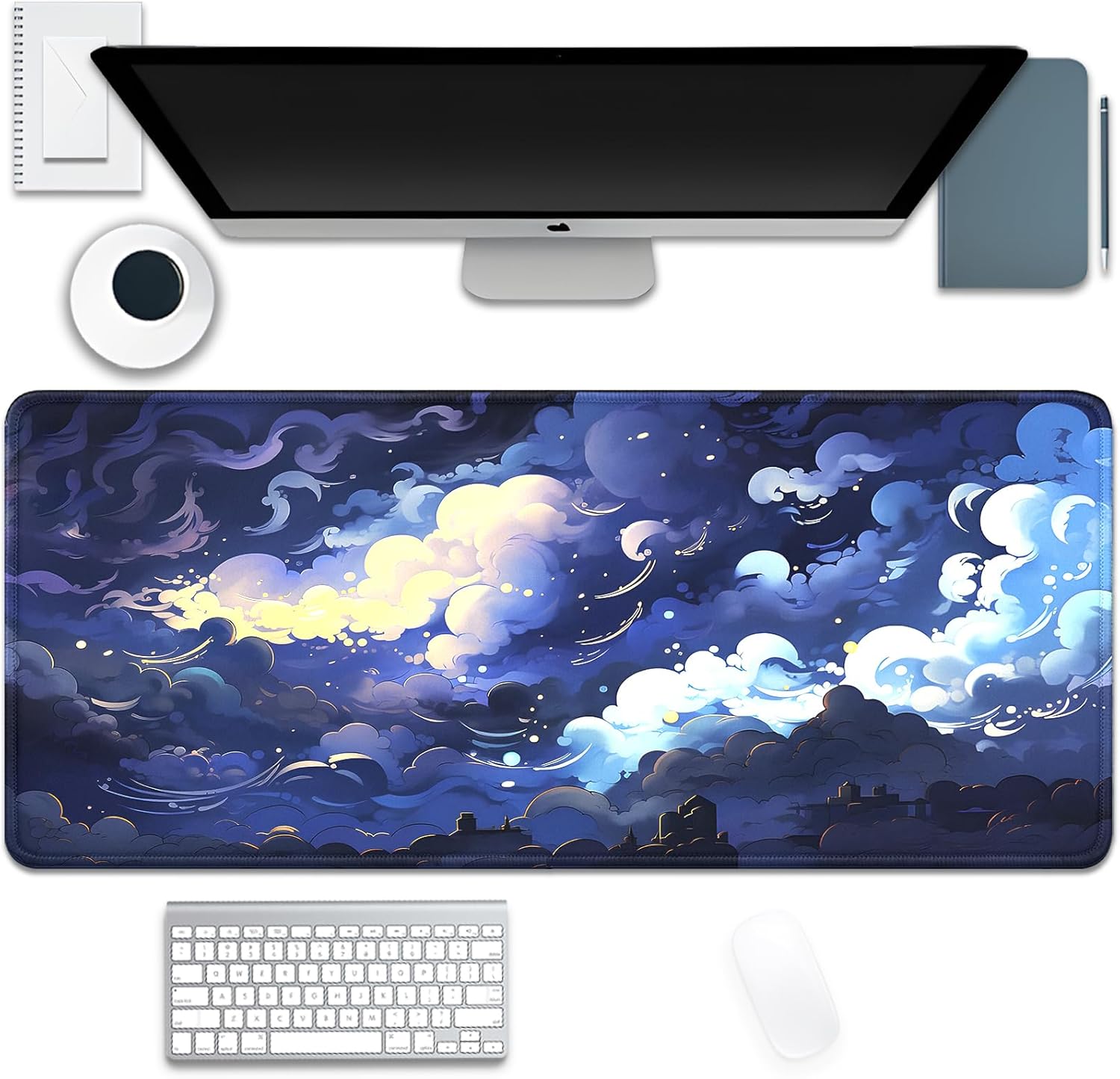 Blue Clouds Mouse Pad,Extended Stars Sky Dark Blue Clouds Mousepad Desk Pad with Stitched Edges,Non-Slip Waterproof Rubber Base Mouse Mat for Office Computer Keyboard Laptop Home(27.5x11.8 in)