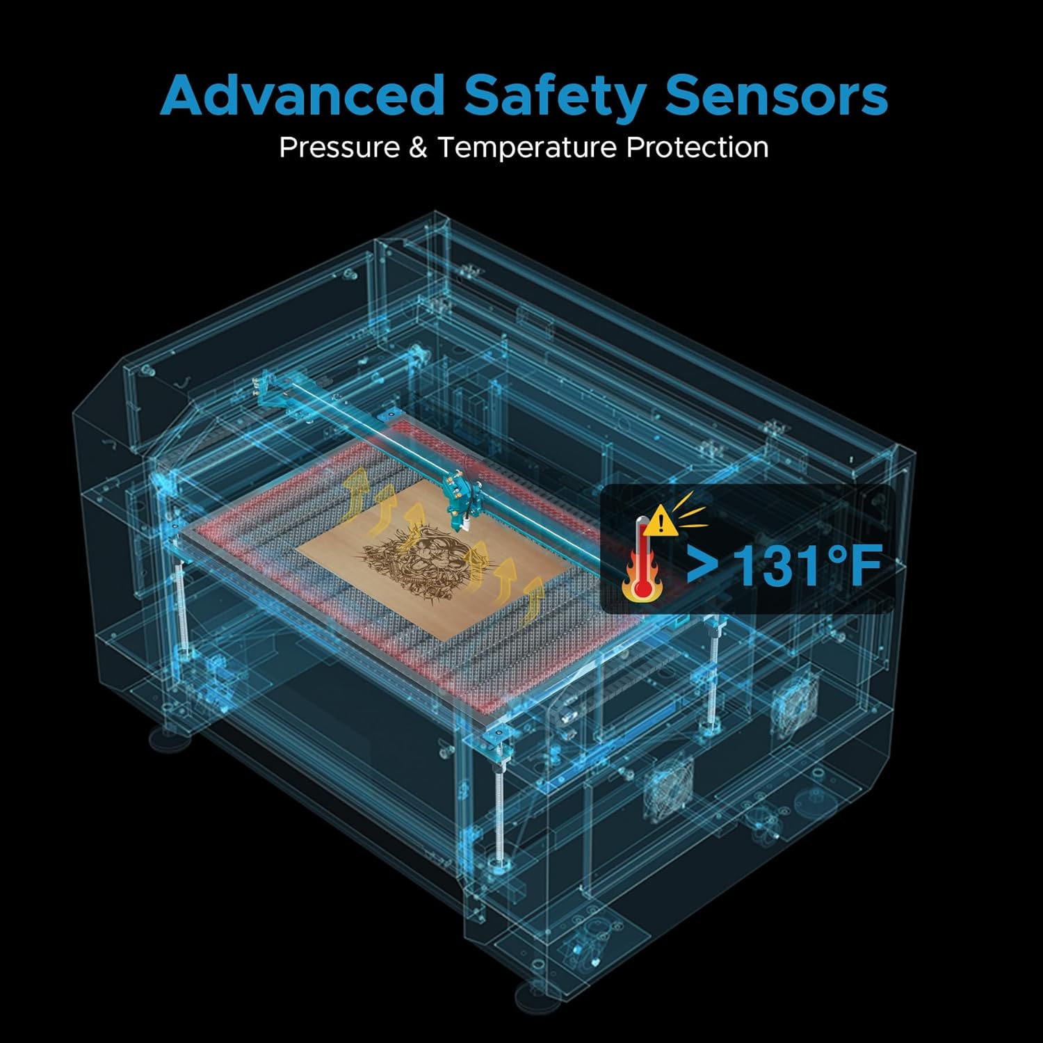 - Safety at the Forefront: Dual safety mechanisms on the front cover and waste box ensure secure operation. Integrated pressure and temperature sensors provide real-time monitoring, minimizing fire risks—so you can engrave with confidence