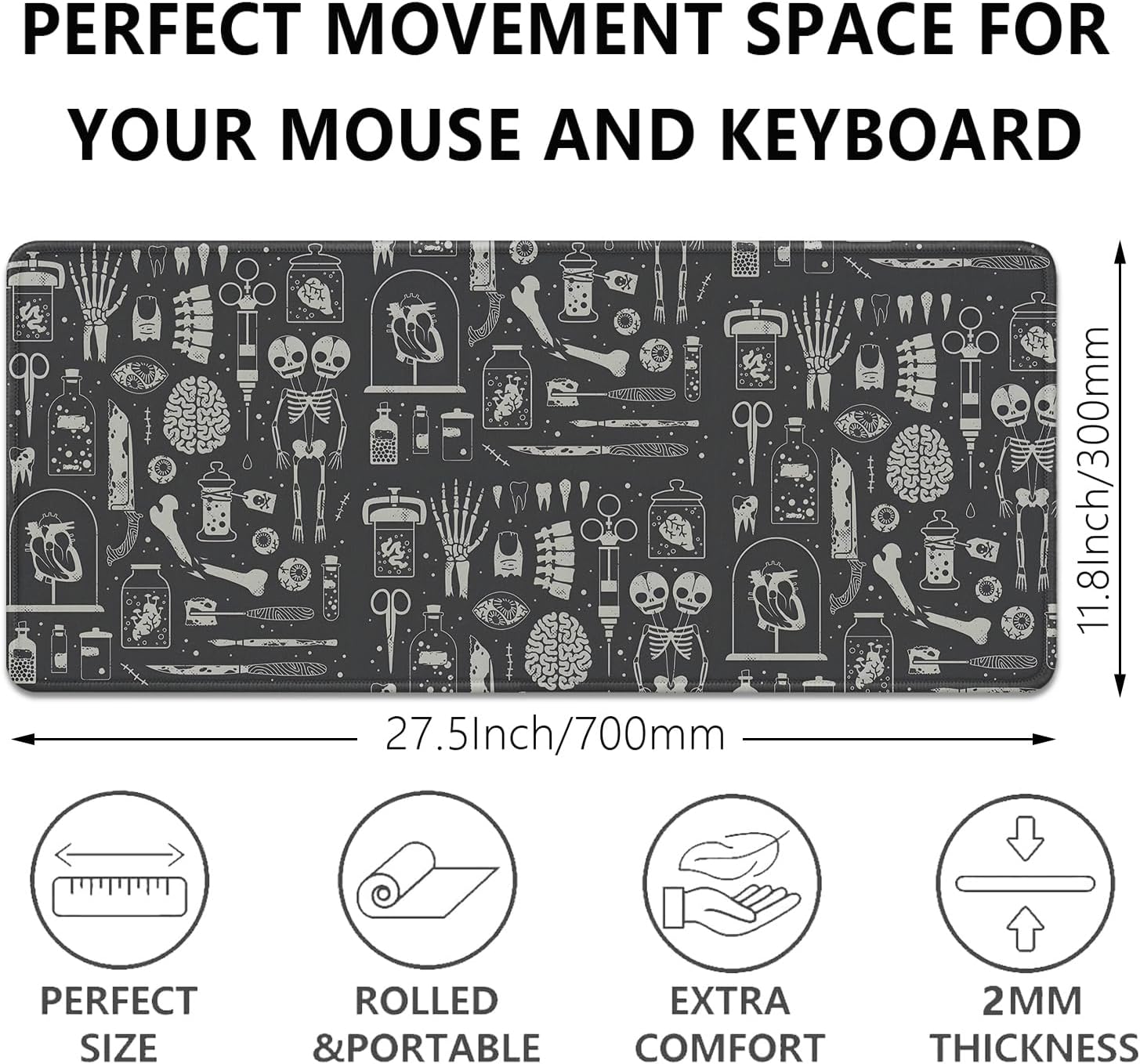 Human Skeleton Medical Mouse Pad,Large X Ray Mousepad Desk Pad with Stitched Edges,Non-Slip Waterproof Rubber Base Mouse Mat for Office Computer Keyboard Laptop Home(27.5x11.8 in)
