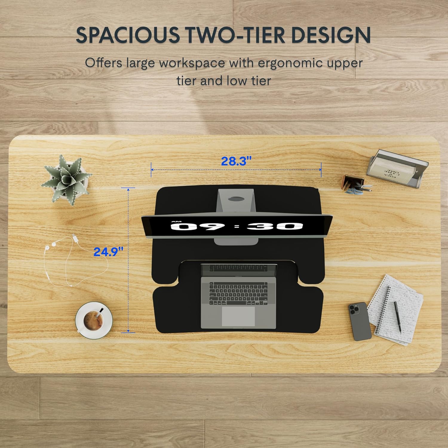 - Spacious Workspace: You gain ample space for all your essentials with this riser. The upper desktop comfortably accommodates your monitor or laptop, while the keyboard tray provides a dedicated area for your keyboard and mouse. Additionally, the unique U-shaped design of the upper deck allows you to place your laptop directly on the tray, optimizing space for a clutter-free workstation. Enjoy the flexibility to arrange your workspace exactly, ensuring maximum efficiency.