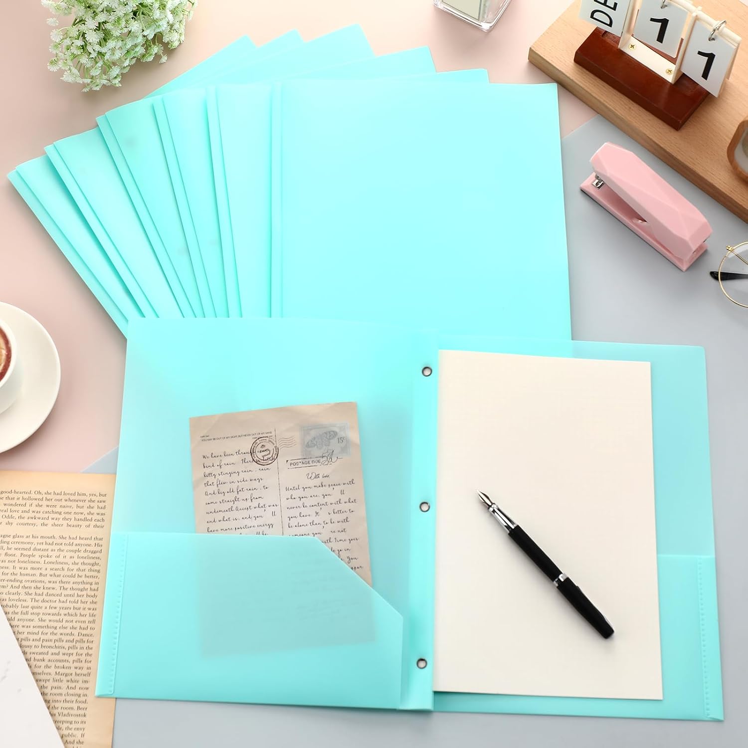 Patelai 48 Pcs Plastic Folders with 2 Pockets and 3 Prongs Home Folders with Card Slot Letter Size Heavy Duty Report Covers for Back to School(Mint Green,Classic)