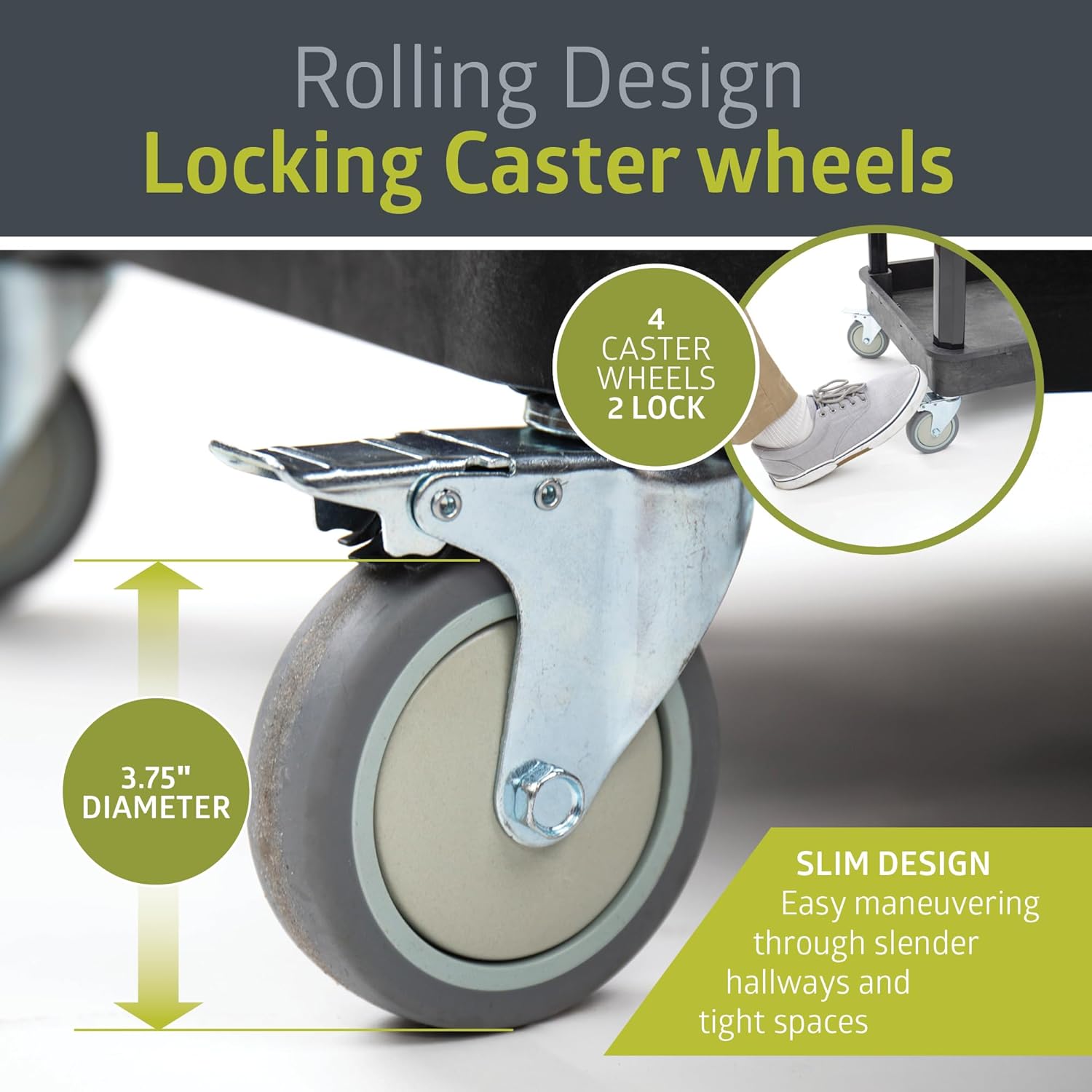 - PUSH HANDLE AND CASTER WHEELS: Complete with an ergonomic push handle and four 3.75" diameter caster wheels, two of which lock