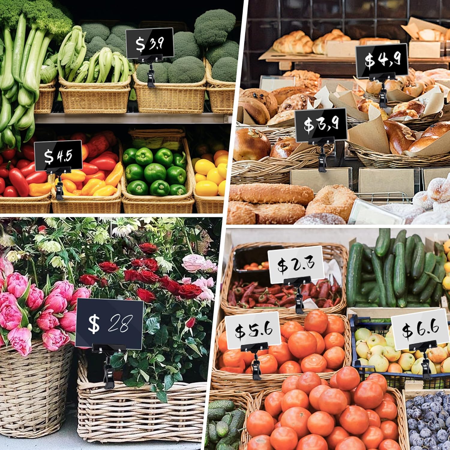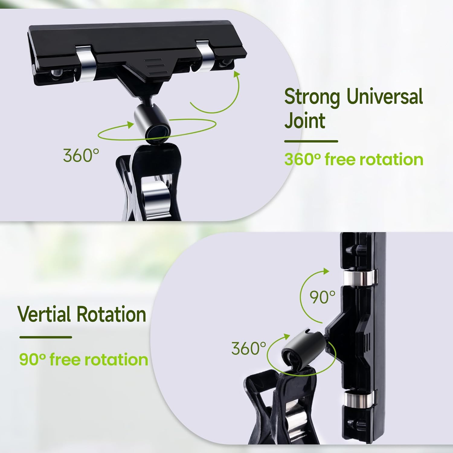 - Unique Double Clip Design: The plastic clips feature a dual-clip design, incorporating a bottom clip for the gripper and a horizontal clip for the sign. These two clips are connected by a black ball joint, providing exceptional flexibility in use. The label clips can rotate easily through a full 360 degrees, enabling comprehensive presentation of the label information from multiple directions and angles.