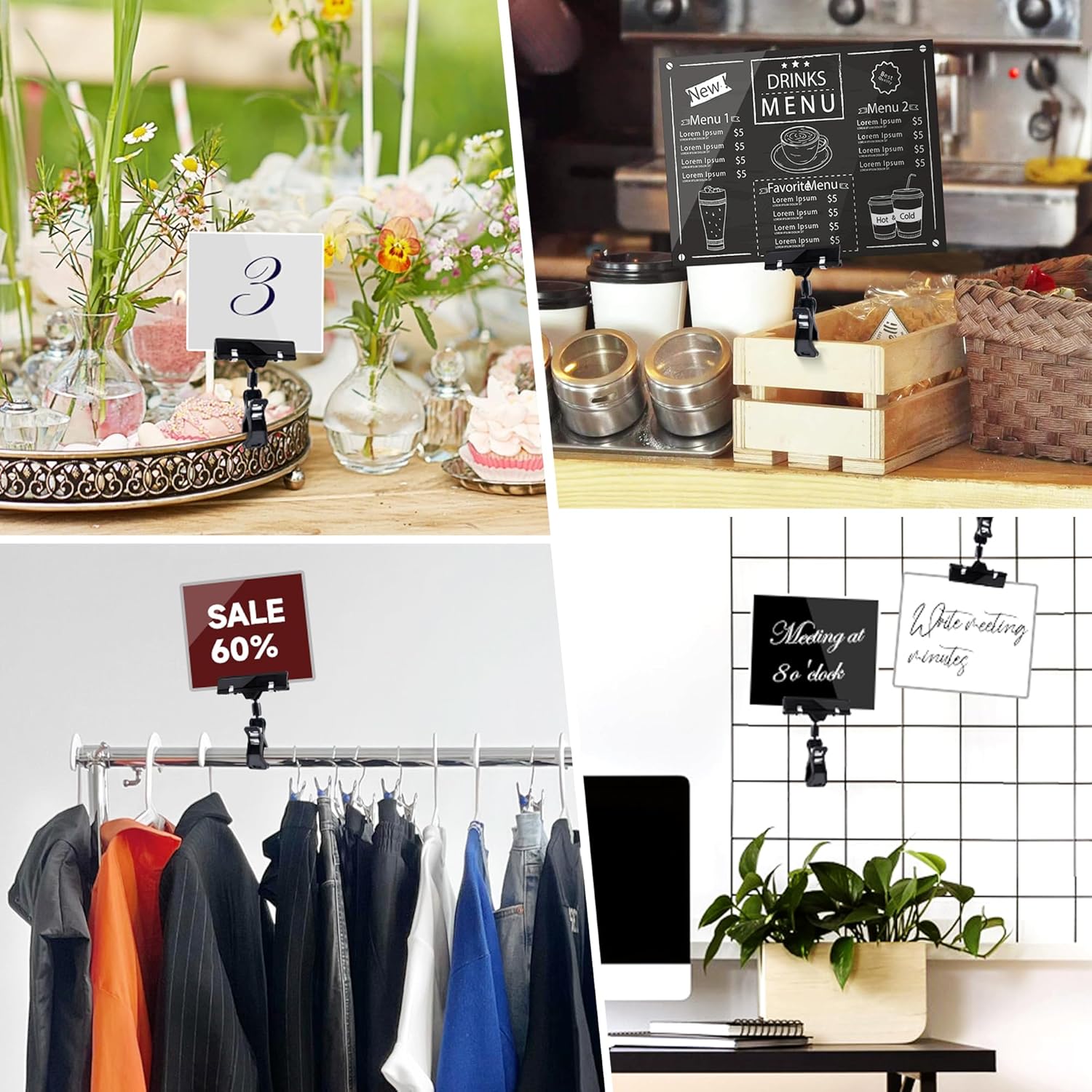 - Widely Applications: Clip-on sign holders are suitable not only for signage display in restaurants, cafes, and stores such as clothing shops, supermarkets, and cinemas, but also for advertising displays and exhibitions in various retail settings. Additionally, they can be used for displaying sticky notes, reminders, and photos at home or in the office, catering to your diverse display needs.