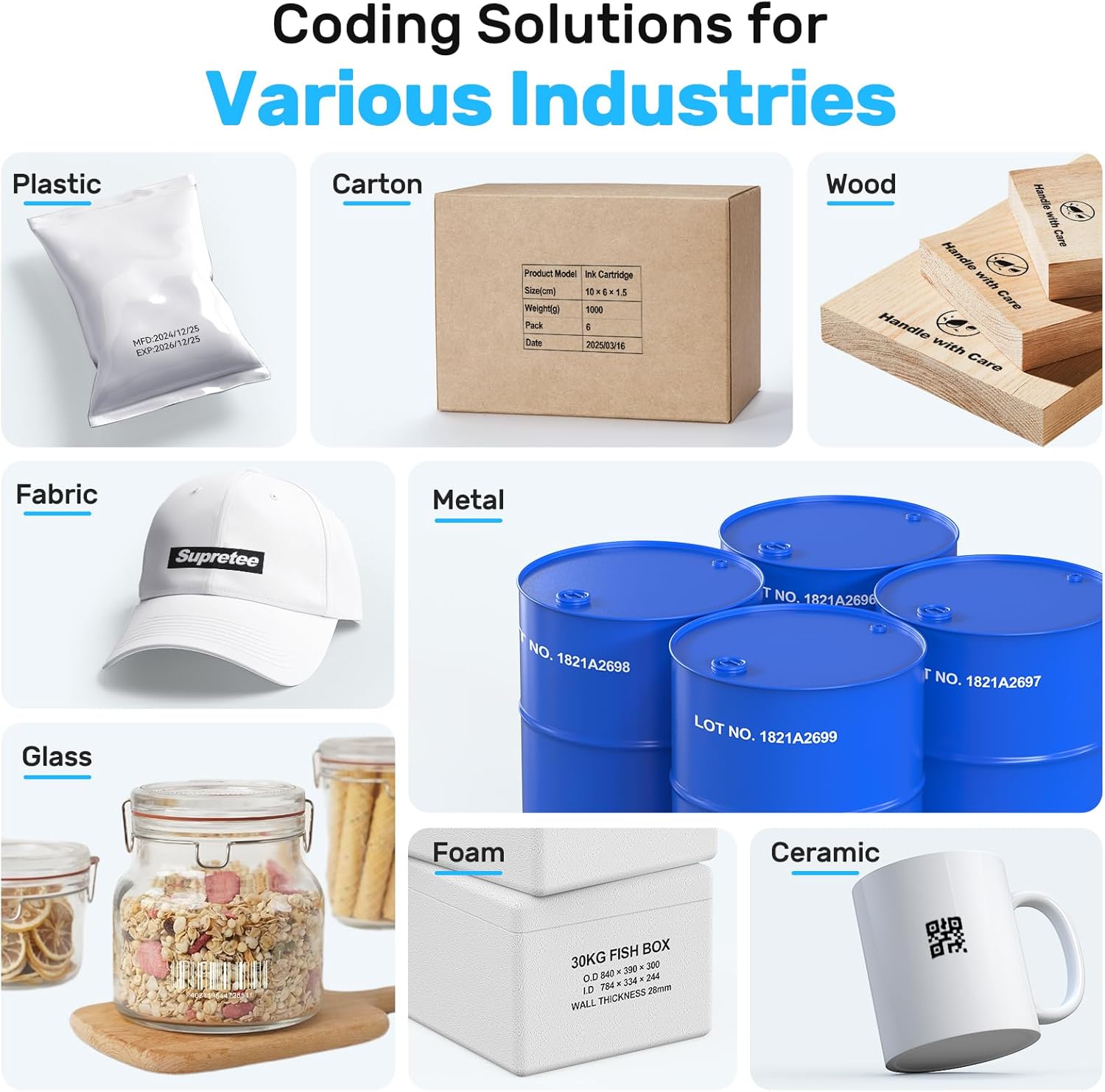 - Ideal Coding Solutions: Comes with 42ml quick drying ink, this inkjet coder prints on almost any surfaces including wood, cardboard, plastic, polyethylene, metal, glass, ceramic, aluminum foil, concrete, etc. Widely used in food and beverage, manufacturing, packaging, logistic, healthcare, cosmetic, etc.