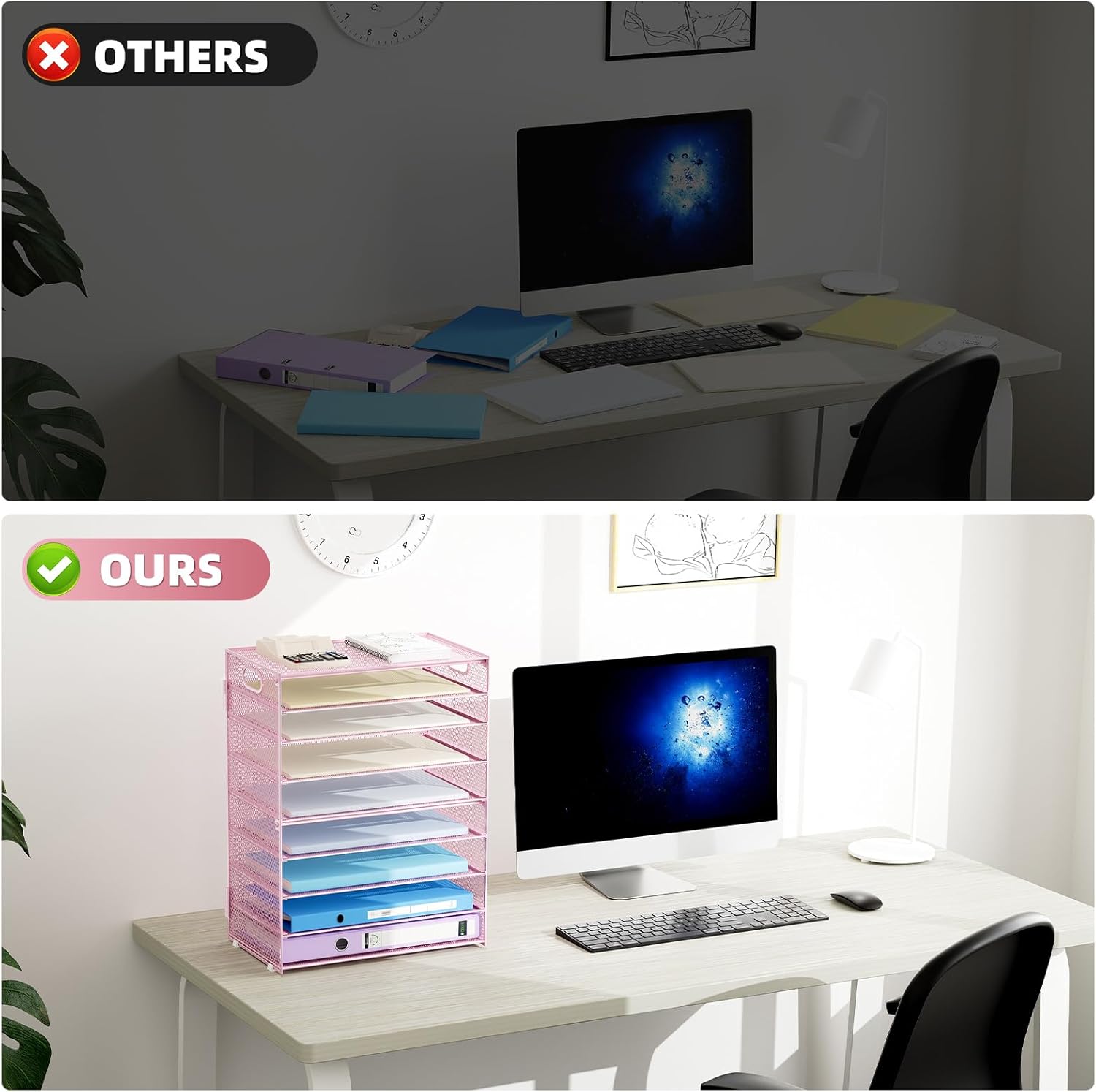 Marbrasse Paper Organizer Letter Tray, 9 Tier Mesh File Organizer with Handle, Paper Sorter Desk Organizer for Home Office Supplies - Pink