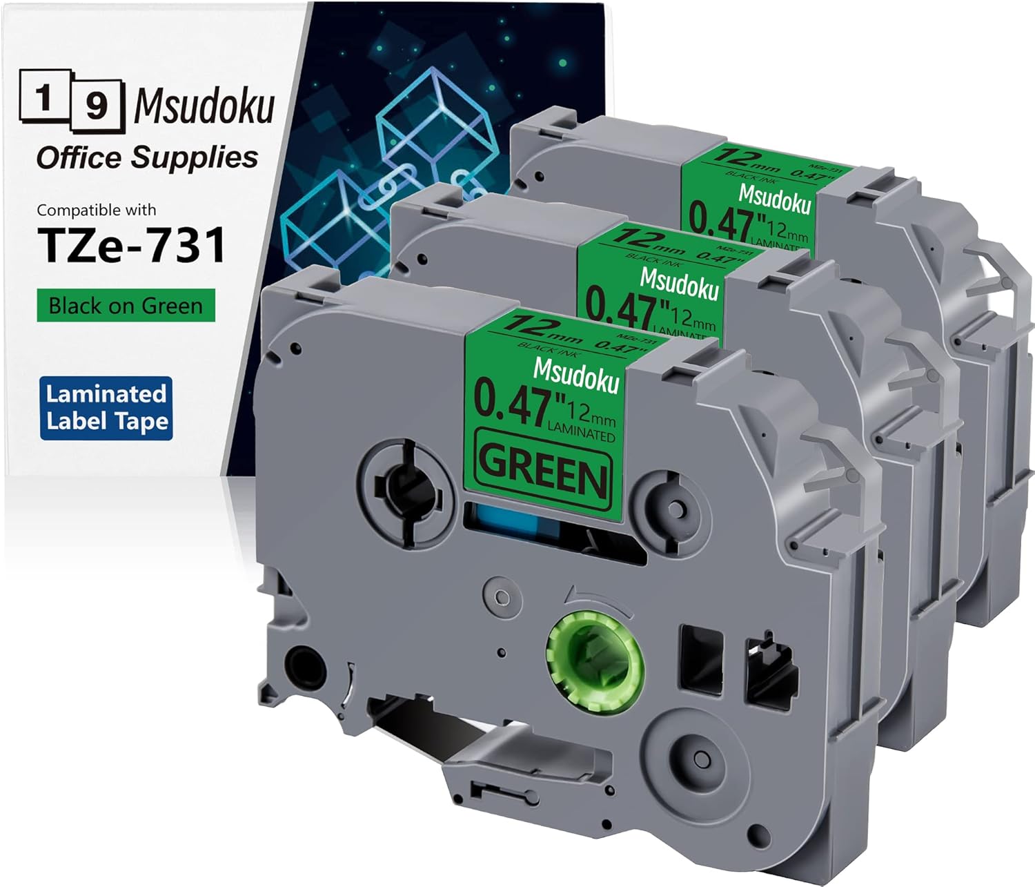 3-Pack Tze Tz Tape 12mm 0.47 Laminated Green TZe-731 TZe731 Label Tape Compatible for Brother P Touch Label Maker Tape for PT D200 D210 D220 D400 Cube, Black on Green, 1/2 Inch x 26.2 Feet