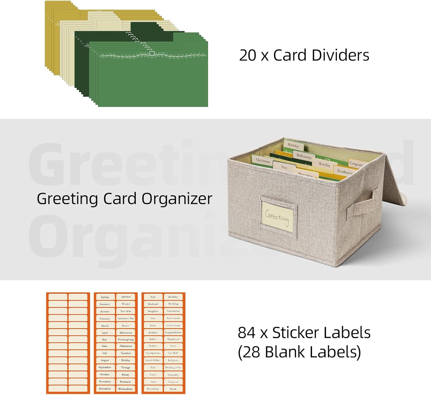 - Make Organizing Easy: The dividers feature double-sided labels for flexible use. You can effortlessly categorize cards by holidays, recipients, and more with the pre-existing labels. Alternatively, the blank stickers allow you to create your own custom categories. This makes it the perfect choice for efficiently storing and sorting cards