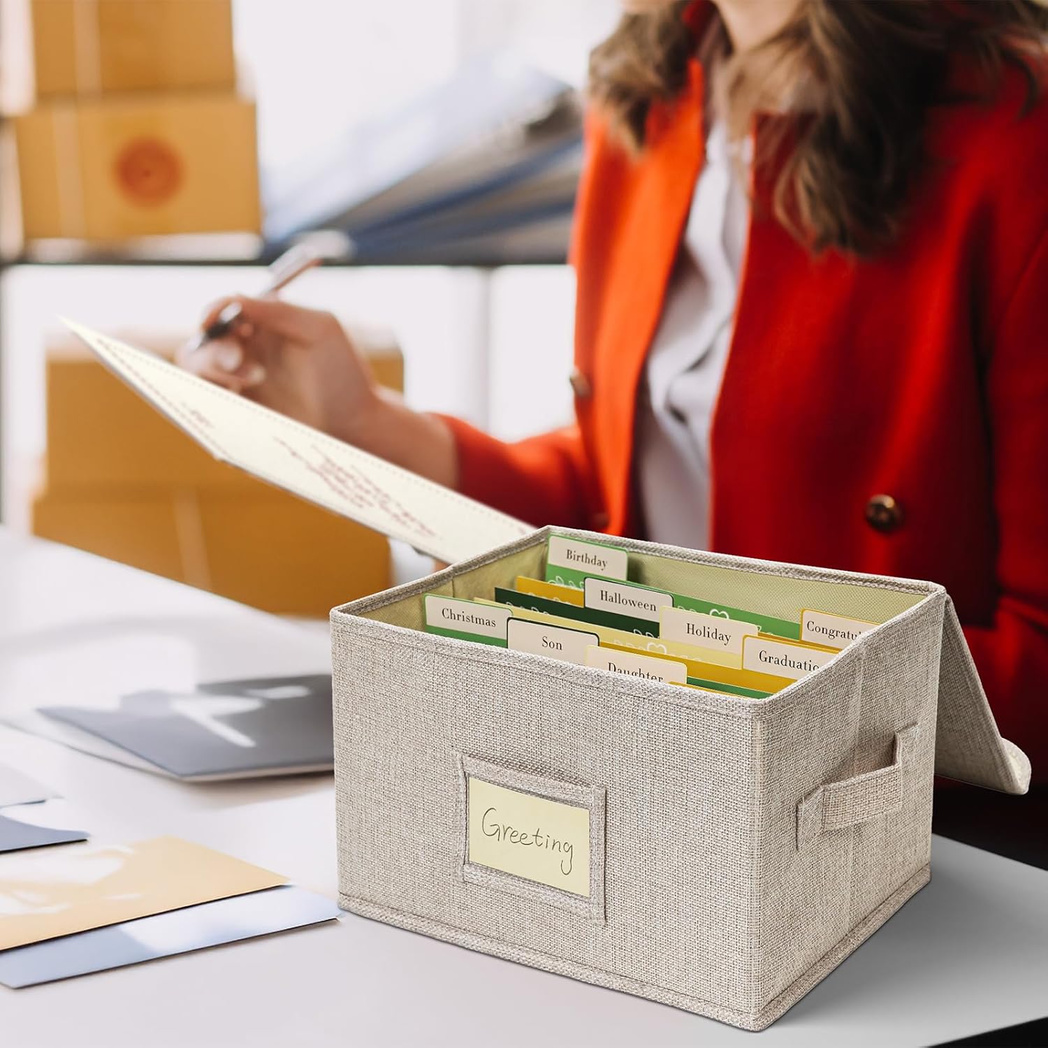 Vienrose Greeting Card Organizer Storage Box with 20 Removable Dividers, 84 Self-stick Labels, Perfect for Photos, Envelopes, Scrapbooking, Paper, Stickers Holder 2 Pack Beige