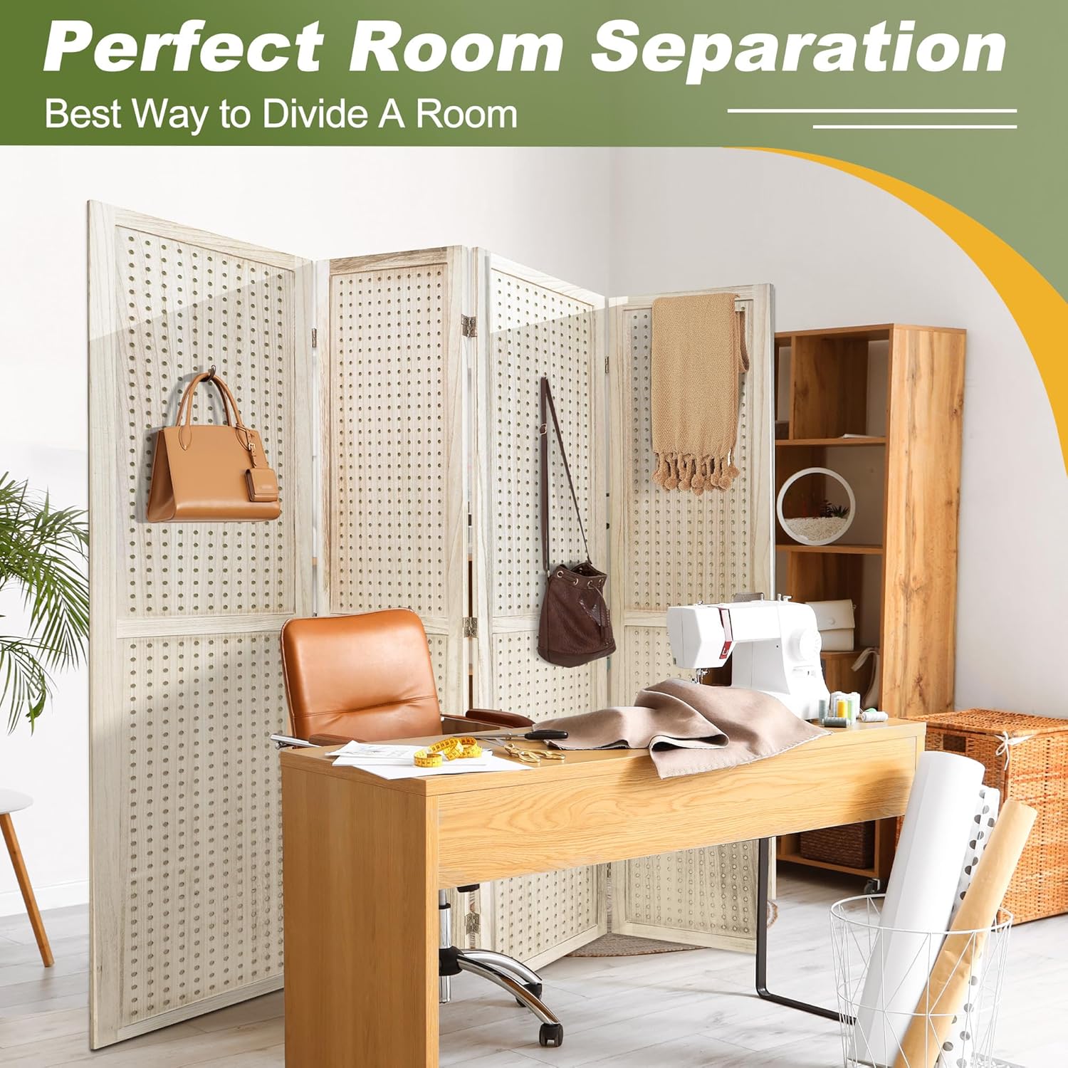 NicBex Room Divider 4 Panel Pegboard Display 5.6FT Wood PegBoard Room Dividers, Folding Privacy Screens Portable Display Board Wall Divider for Craft/Art Shows, Room Separation, Natural Wood