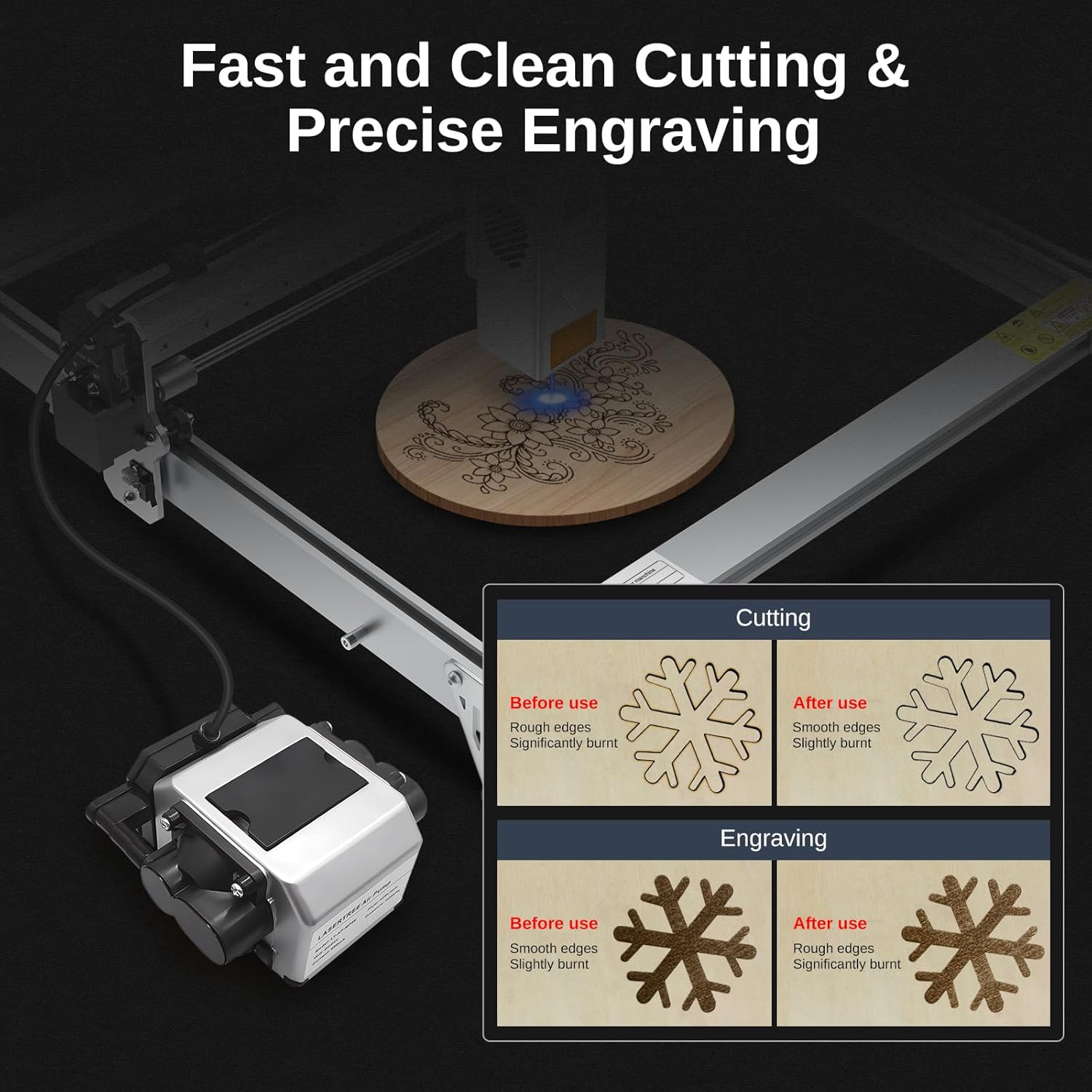 - Get a Clean Surface and Smooth Edge: The powerful air assist pump's airflow quickly reduces the surface temperature of cutting objects, helps minimize burning during cutting, prevents distortion and discoloration due to excessive burning, and makes the cutting edge smoother and cleaner.