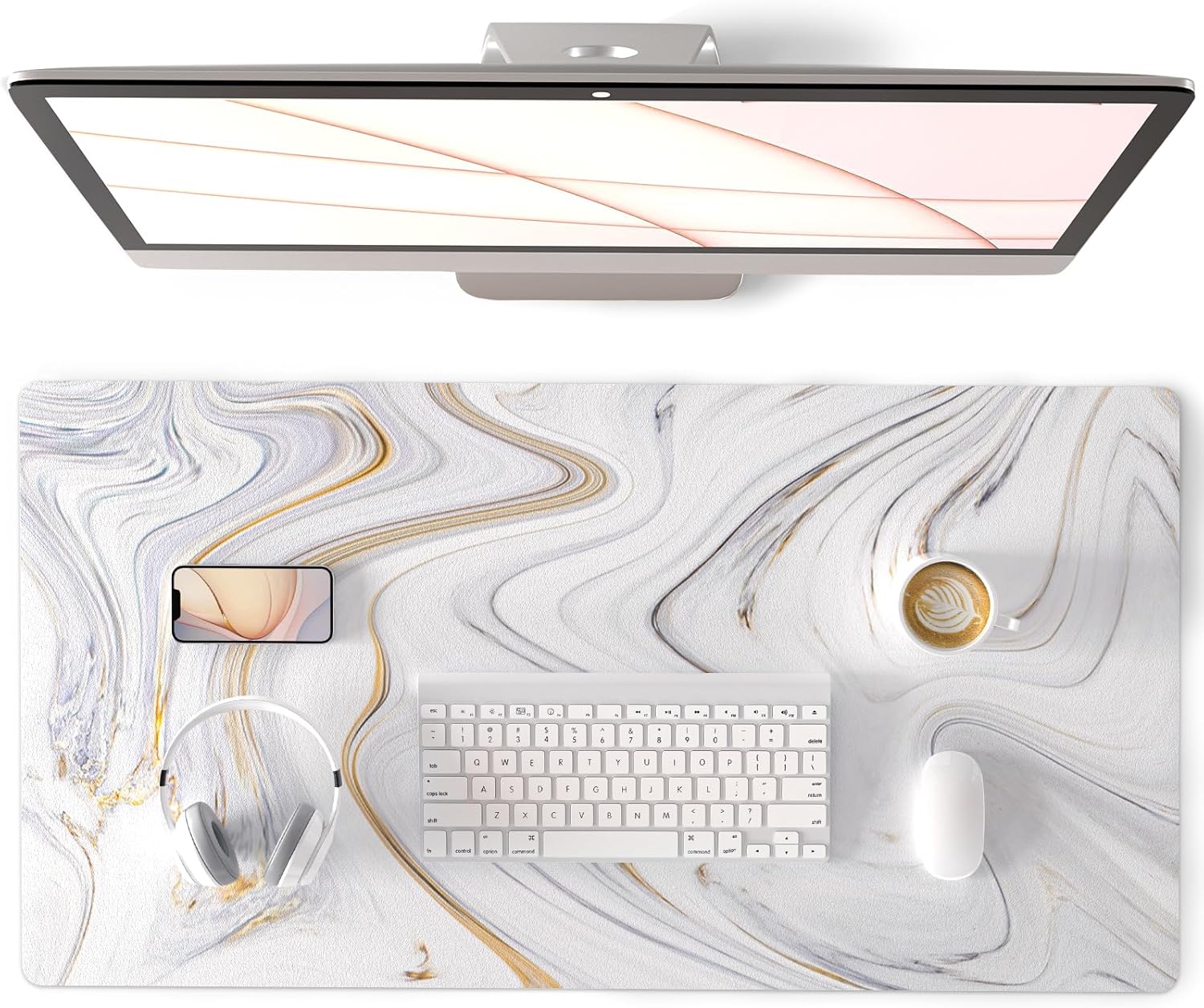 QIYI Large Mouse Pad, Cute Marble White Desk Mat, PU Leather Desk Protector Mousepad, Gold Grey Striped Waterproof Computer Keyboard Gaming Mouse Pads, Non Slip Extended Writing Pad 31.5" x 15.7"