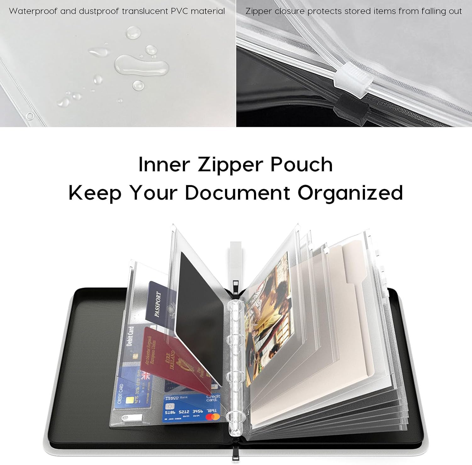 - Binder Pockets: The document holder includes 8 pcs A4 4-holes binder pockets, 4 pcs B5 binder pockets, 1 pcs card slot page holds 6 bank cards and USB