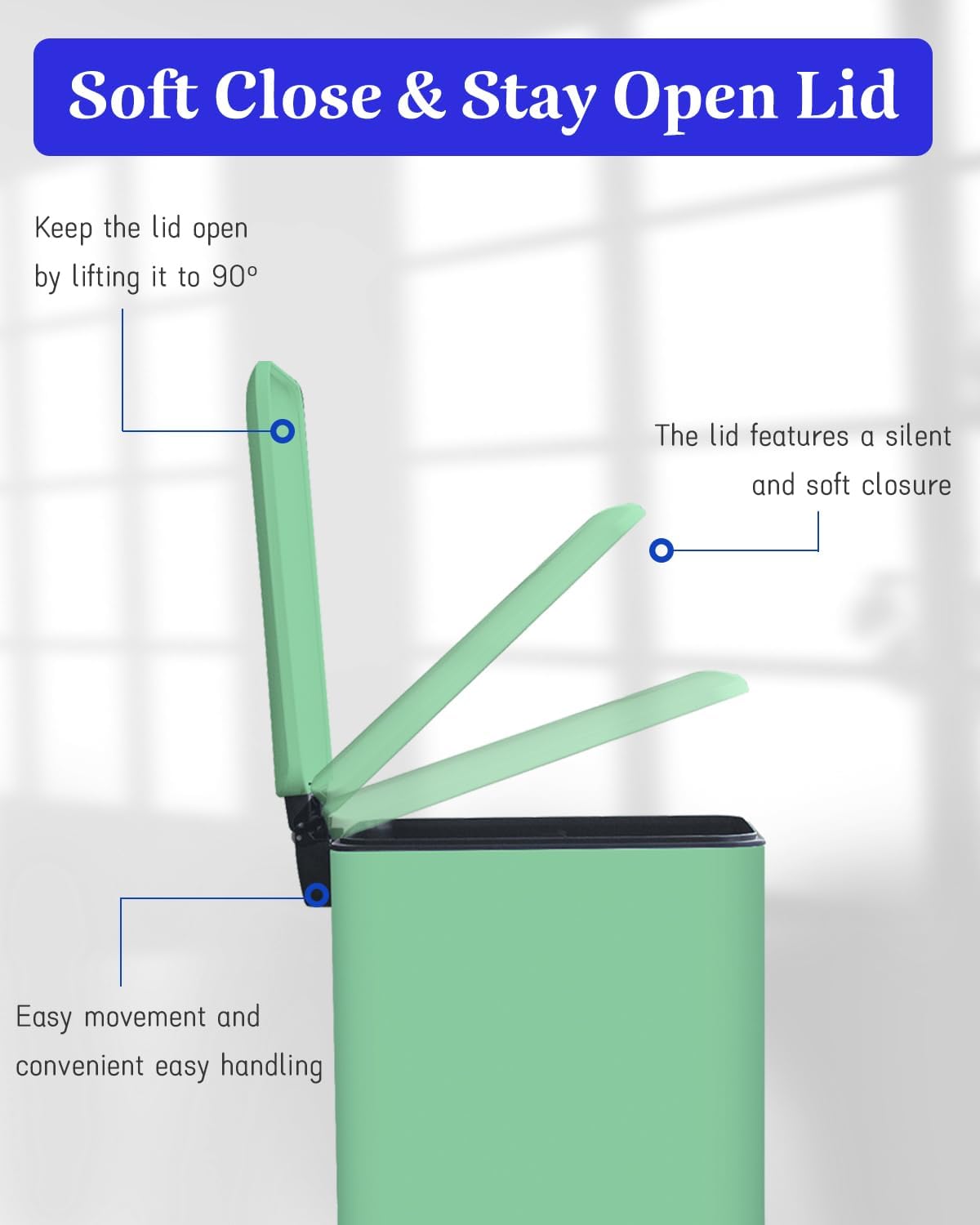 - SOFT CLOSE LID The rectangular bin features a soft-close component, so the lid can be slowly lowered and closed quietly to avoid annoying noise.