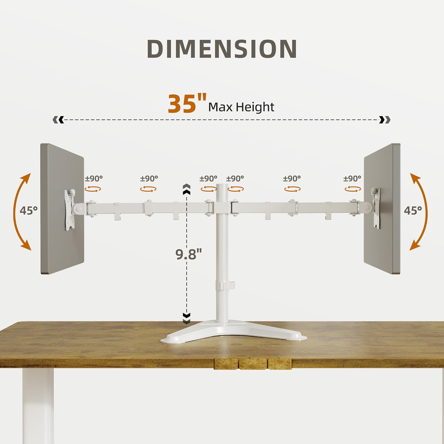 - Full Motion Adjustment: This monitor stand offers multi adjustability with +90°/-90° swivel, and +45°/-45° tilt. These features allow for optimal screen positioning to enhance workspace organization and efficient use of desk space.