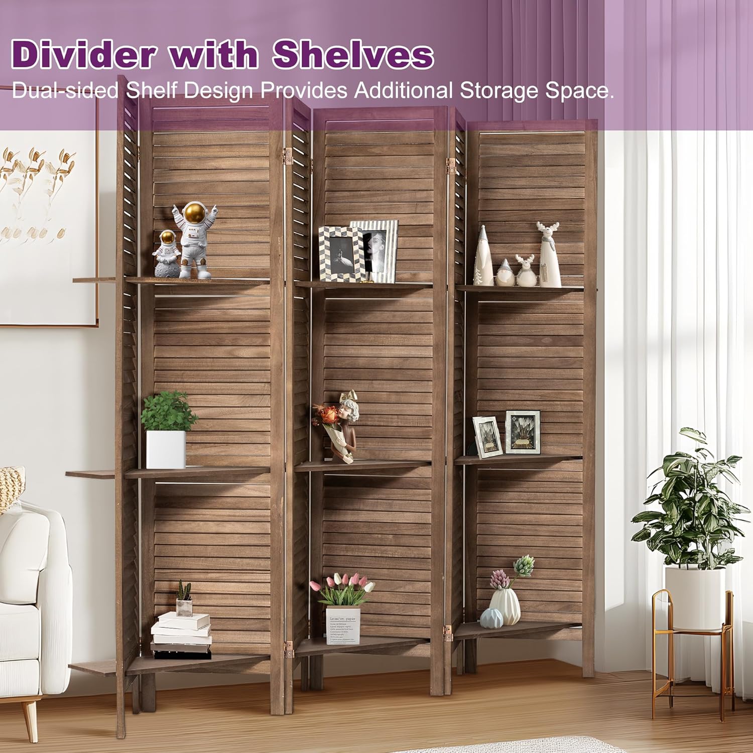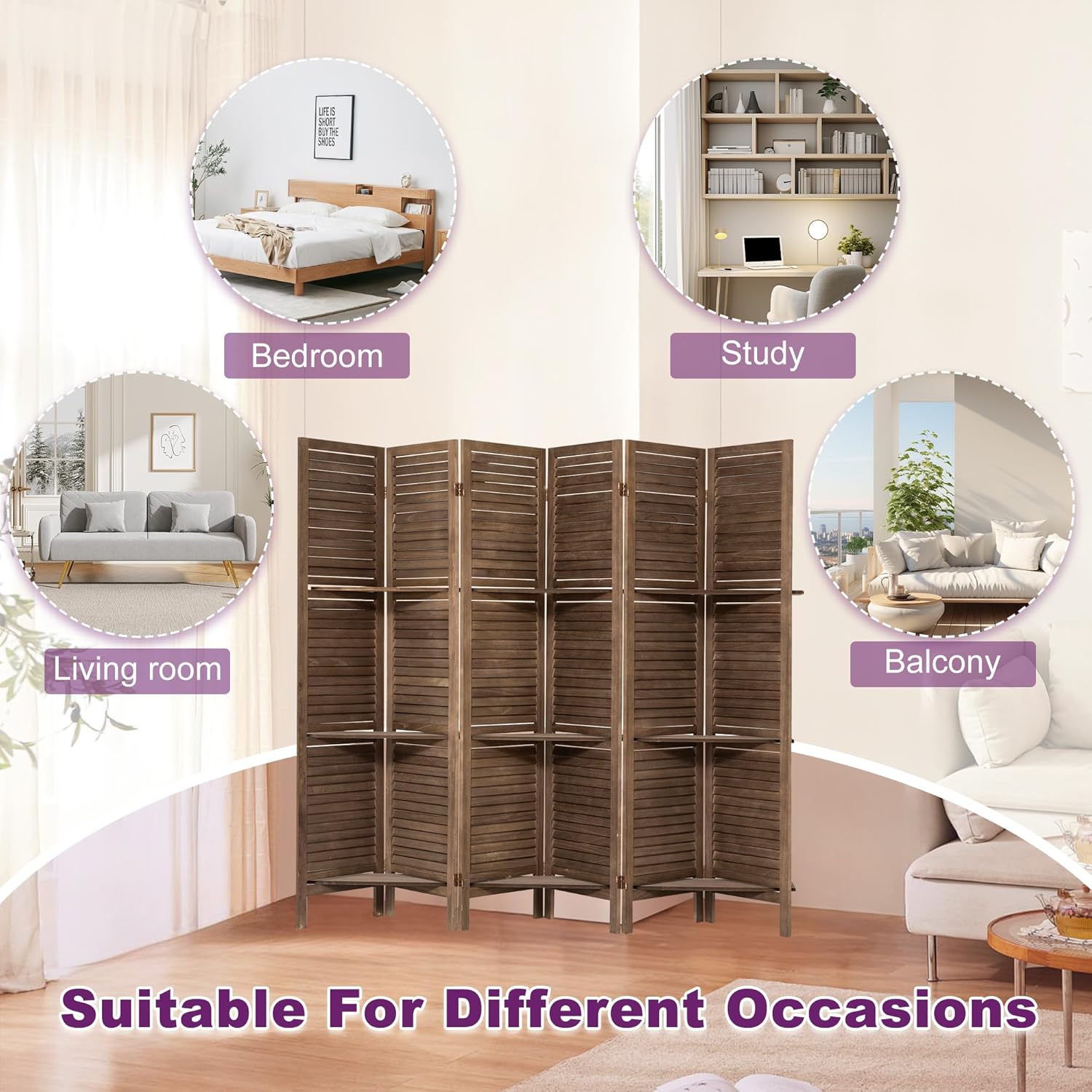 Room Divider with Shelves, 5.6FT Folding Room Divider Panel, 6 Panel Wood Partition Wall Divider for Room Separation, Dark Brown