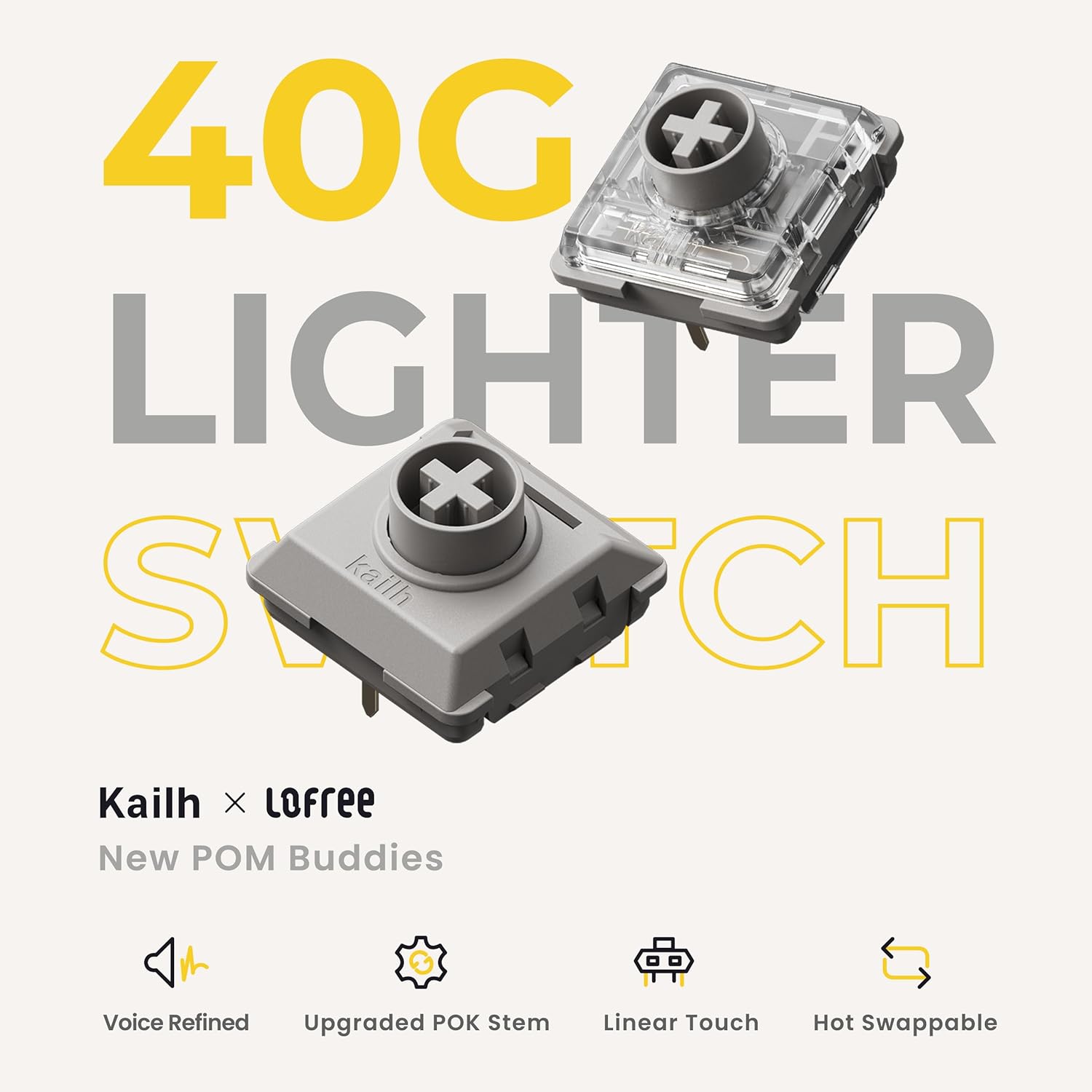 - Specter Full POM Linear Switches: New members of the Lofree and Kailh Low-profile Full POM Switch family, Aiming to soften the touch and reduce muscle strain on wrists with fingers curved naturally, we lower the operating force from 50gf to 40gf, significantly reducing finger joint fatigue during long typing sessions