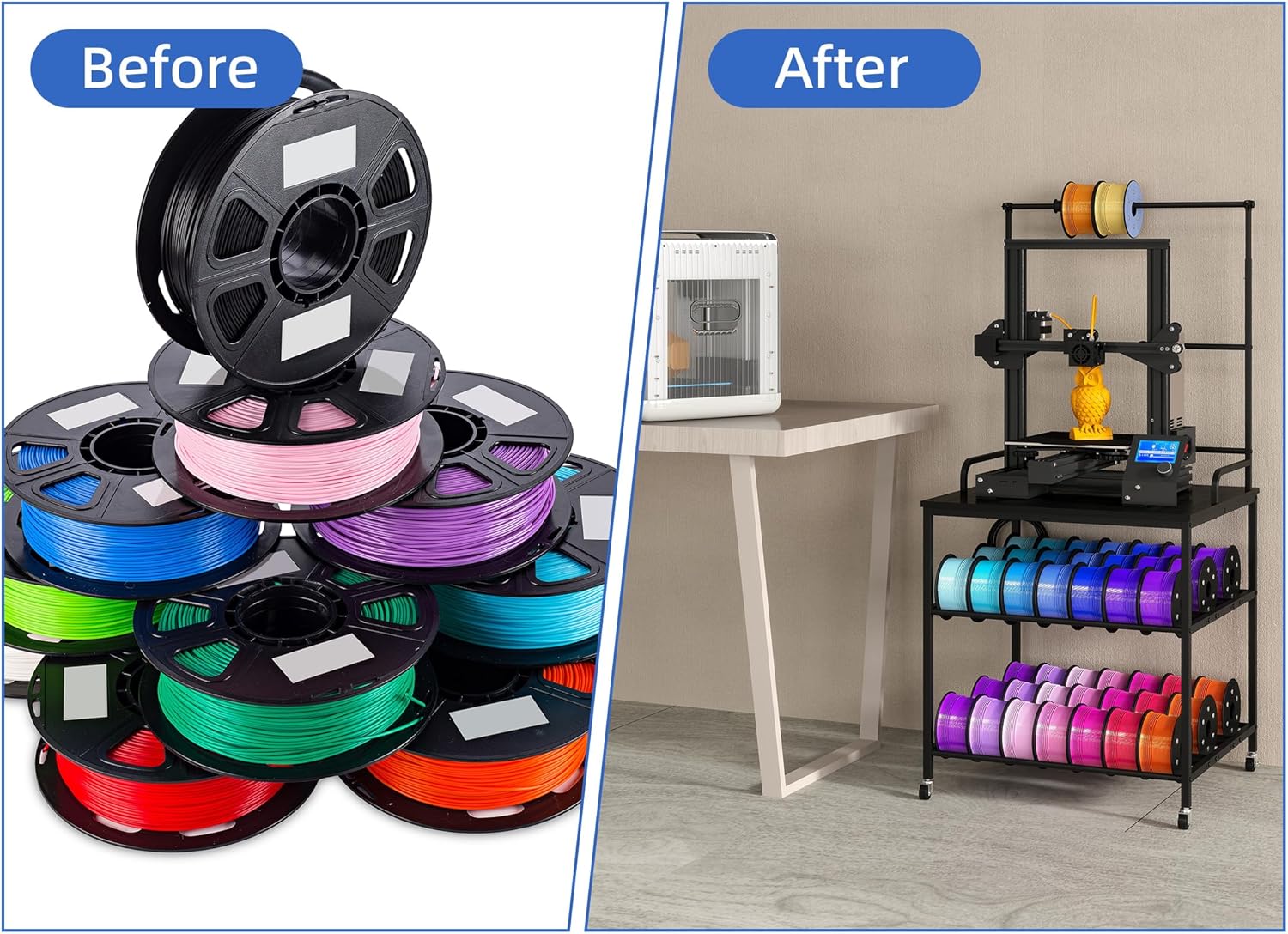 - All-in-One 3D Printer Stand and Filament Storage Stand Solution:This 3D printer stand with storage features a solid wood top (27.5" x 23") that fits most 3D printers and detaches to hold filament spools. The 3D printer table bottom two tiers organize up to 60 spools, 3D printer cart keeping your 3D printing station tidy and space-efficient