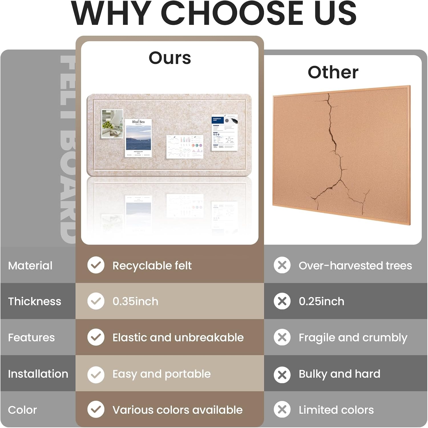 - Premium Material: Made from recycled, thick polyester fiber with no harmful chemicals, this push pin board is lightweight but strong, wear-resistant fire and damping resistant, say goodbye to all the disadvantages of traditional wooden cork boards, reliable use in any environment.