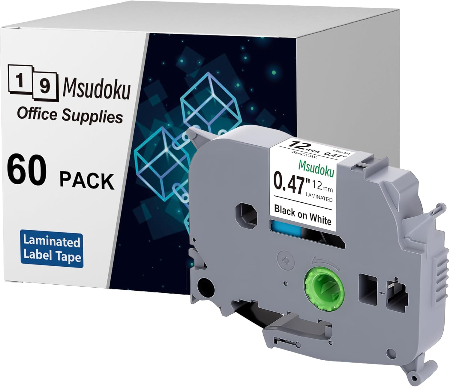 Tze TZ Tape 12mm 0.47 Laminated White Compatible for Brother Label Maker Tape 12mm 1/2" Black on White Tape for Ptouch PT PTD200 PTD410 D210 D220 D610 P710BT PTH110, 60-Pack