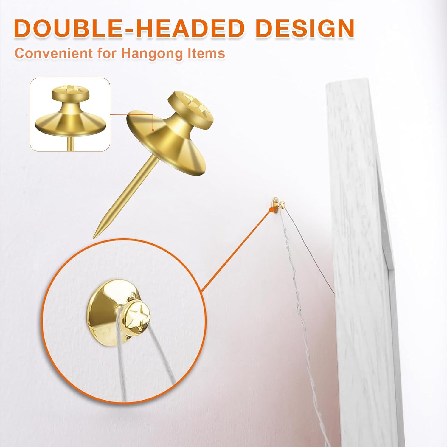 50 PCS Thumb Tacks for Wall Picture Hangers, Double Headed Picture Hanging Nails Kit, Push Pins Wall Hooks, Renter Friendly Decor Thumbtacks for Tapestry Frame Art Photos(Black &Gold)