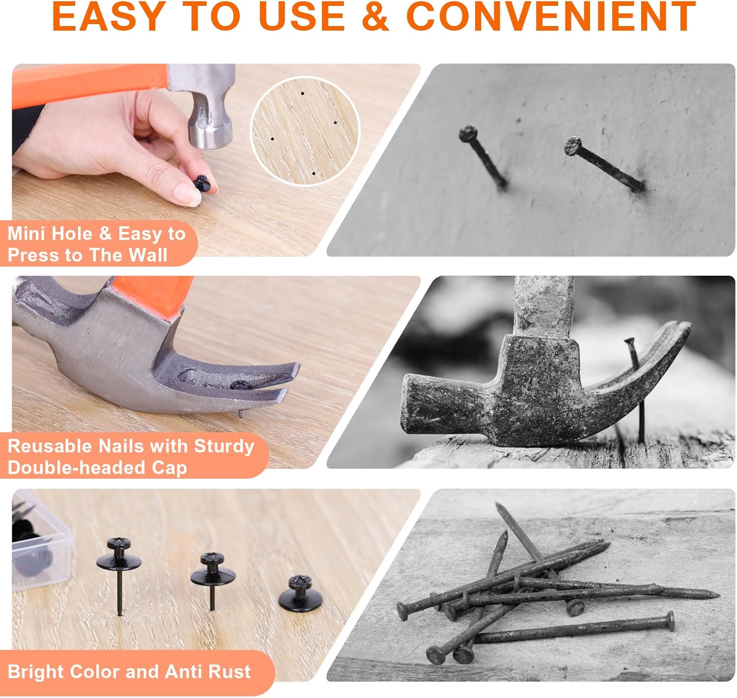 - THUMBTACKS FOR STABLE STRUCTURE: The picture hanging kit are designed with double heads, and the second head provides strong support for the nails for hanging pictures, making it easier to hang heavier objects on the wall without slipping or falling off. Each wall nails for hanging can safely support up to five pounds.
