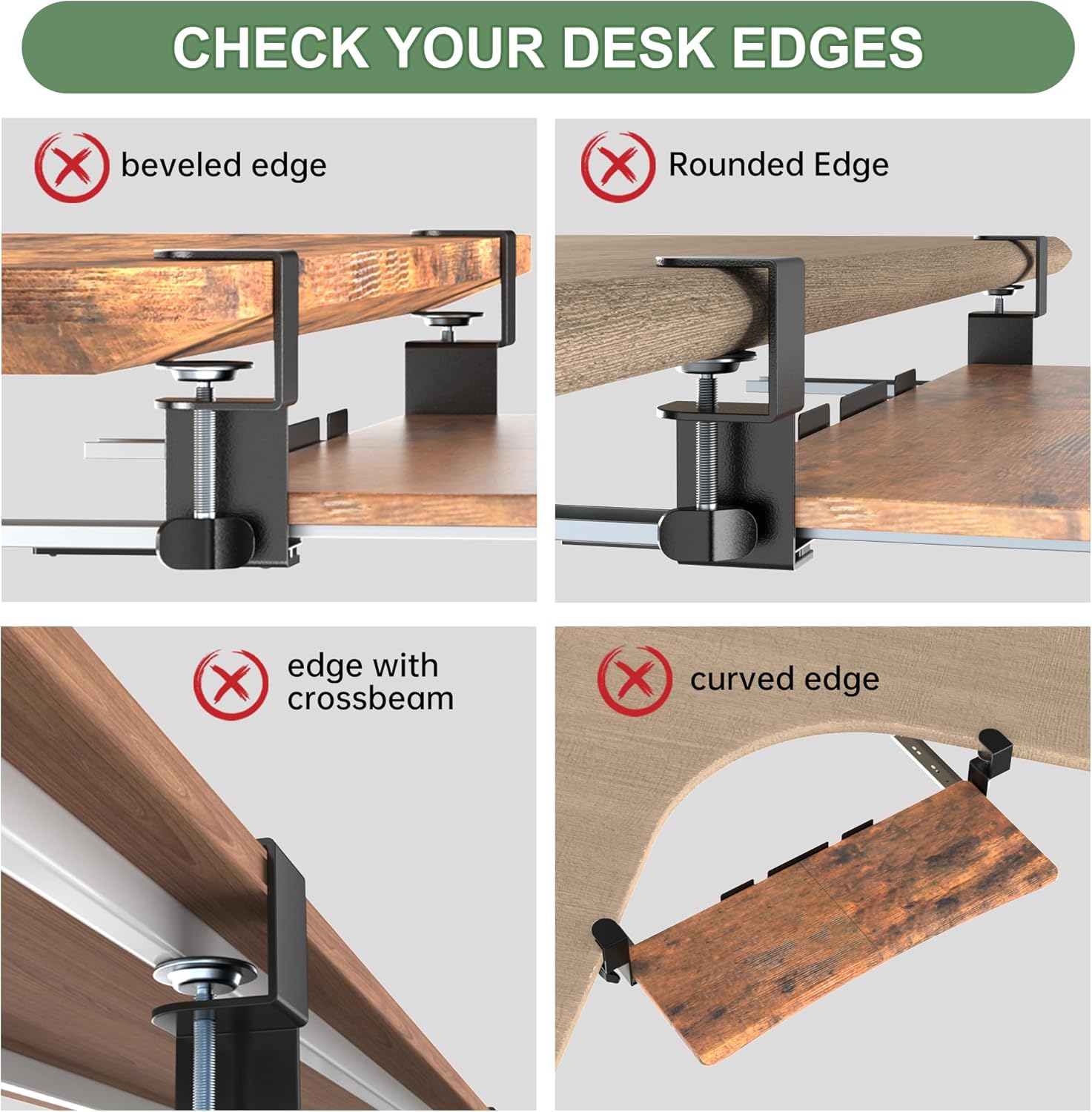 - 【Sturdy C-Clamps】 Attach the keyboard tray to your workstation without causing any damage to your desk (2.17” Maximum Desk Thickness) with sturdy C-clamps that hold everything tightly in place and are easily adjustable for user convenience. comes with a non-slip EVA pad design to avoid scratches and damage to the desk, you can install and use it with confidence. Before purchasing, please make sure that your desk surface does not exceed a thickness of 2.17".