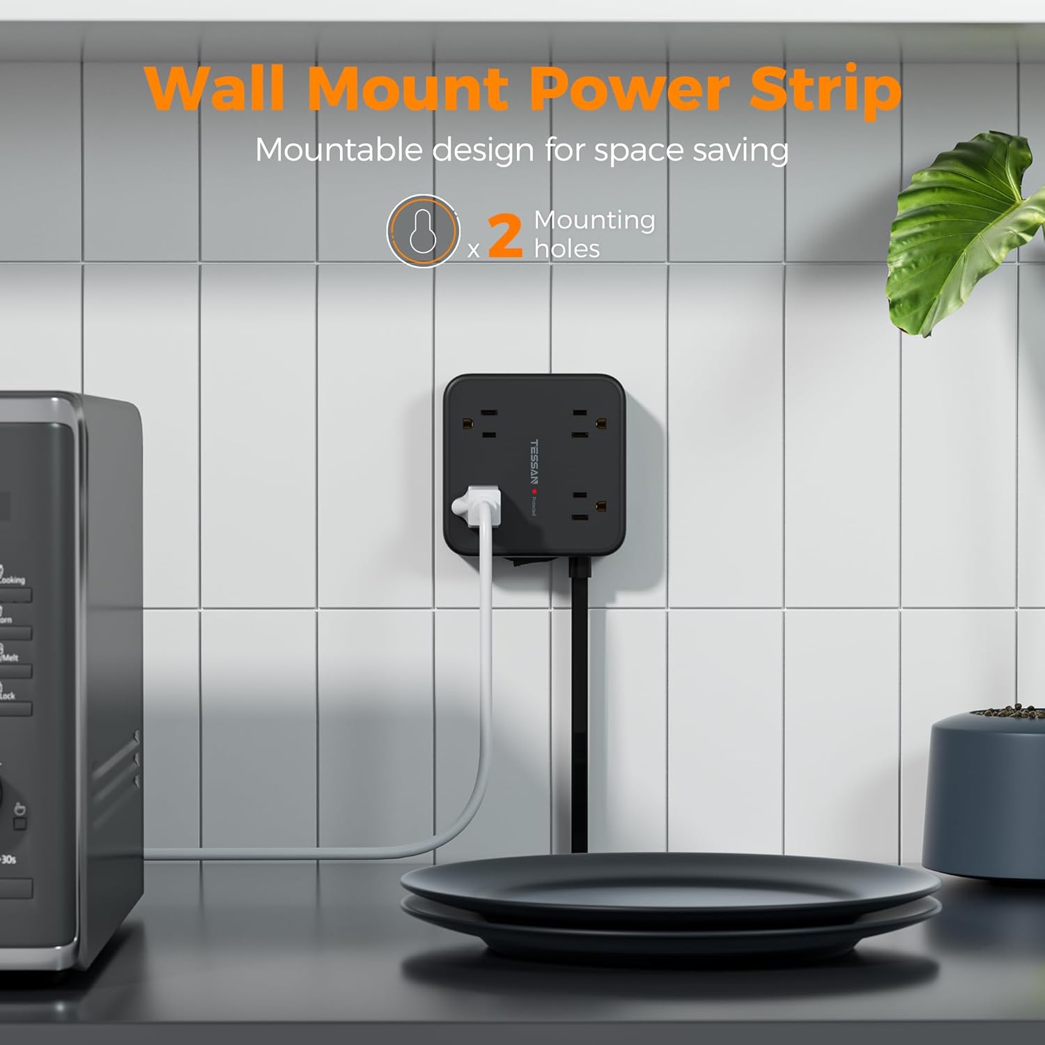 - Mountable Power Strip: 2 mounting holes design allow the extension cord flat wall plug securely installed in various applications, such as wall mounts, floor mounts, under counters and more; 4 rubber feet at the bottom efficiently keep it from slipping and sliding