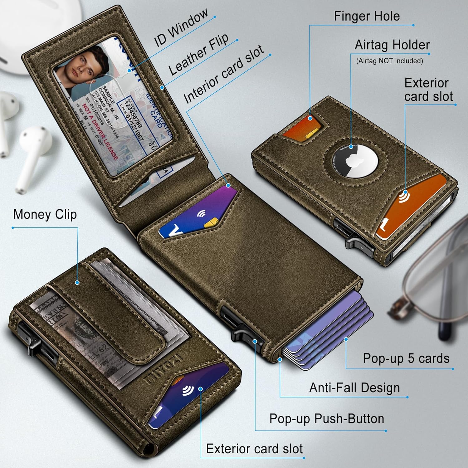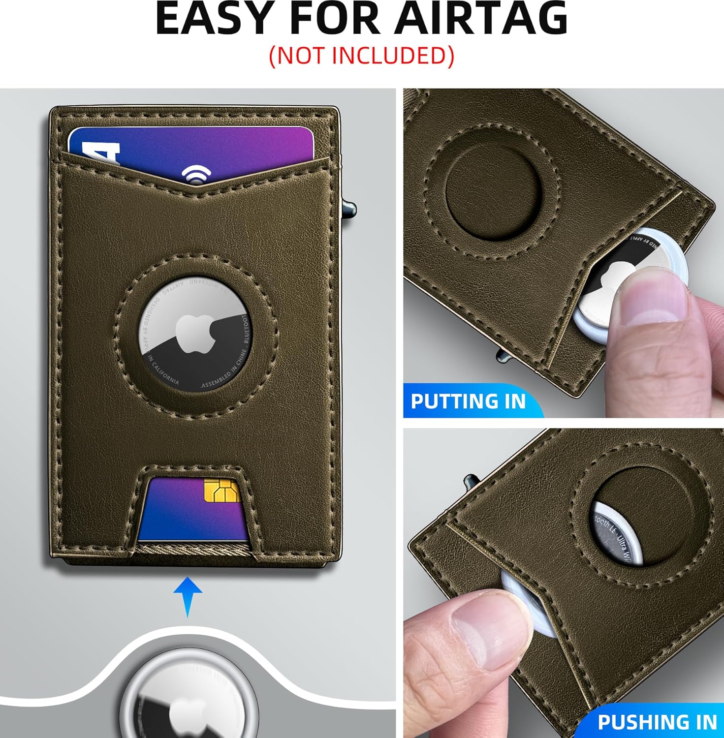 - AMPLE STORAGE--Easy for 9 cards and holds Airtag,Slim wallet with refined layout to fit in front pocket,the money clip with Leather wrapped for carry cash,5 cards in the aluminum case with pop-up access,4 cards in the leather shell;
