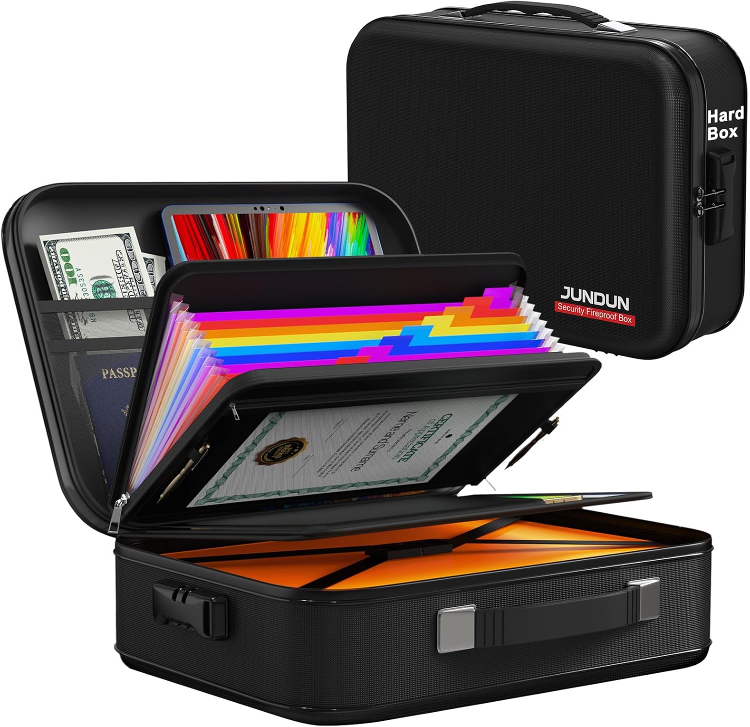 JUNDUN Fireproof Document Box,Hard Case Fireproof Document Organizer with Lock,Home Travel Portable Fireproof Safe Storage Box for Letter Size Documents,files,Papers and Passport,Colourful