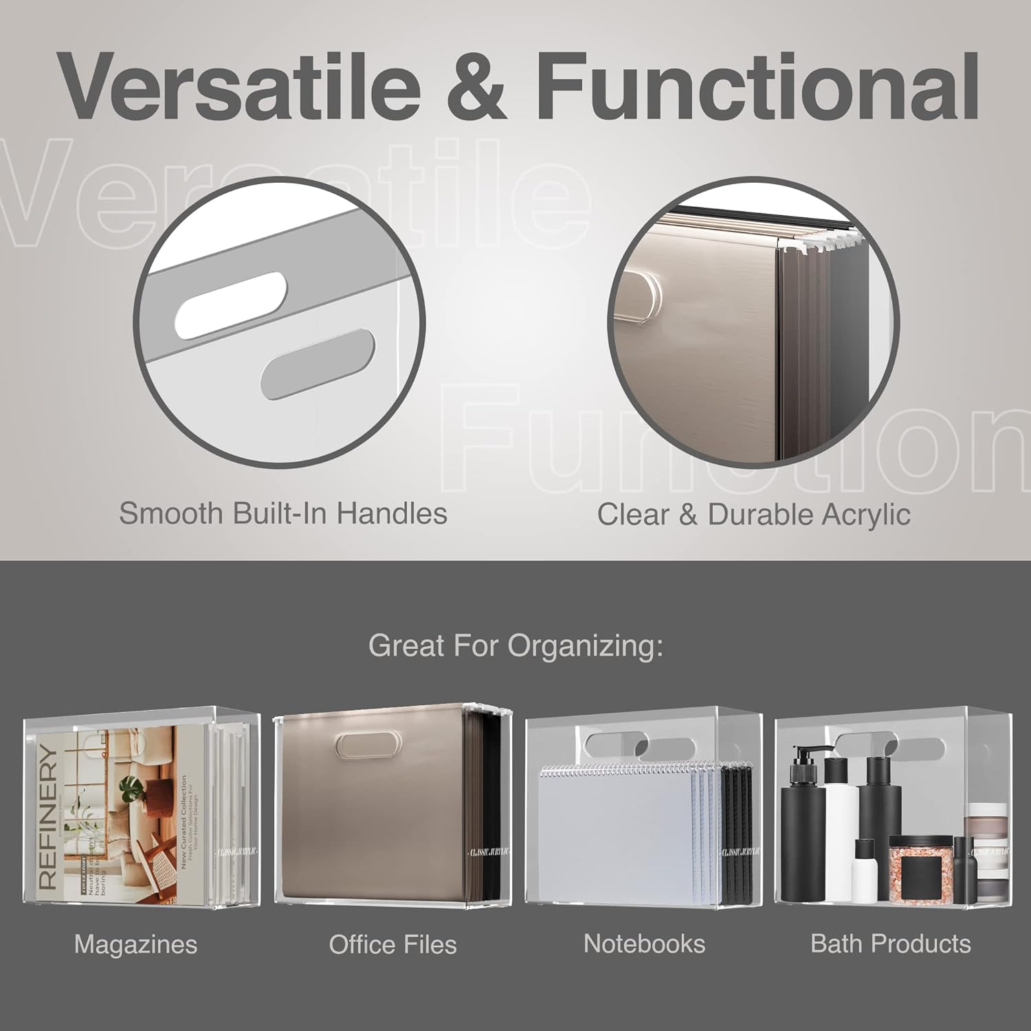 - Function: Keep magazines on display with this sleek and sturdy acrylic holder. This versatile acrylic box is suitable for magazines, books & letter-size hanging file folders. It can also be used as a bin for any needed storage.