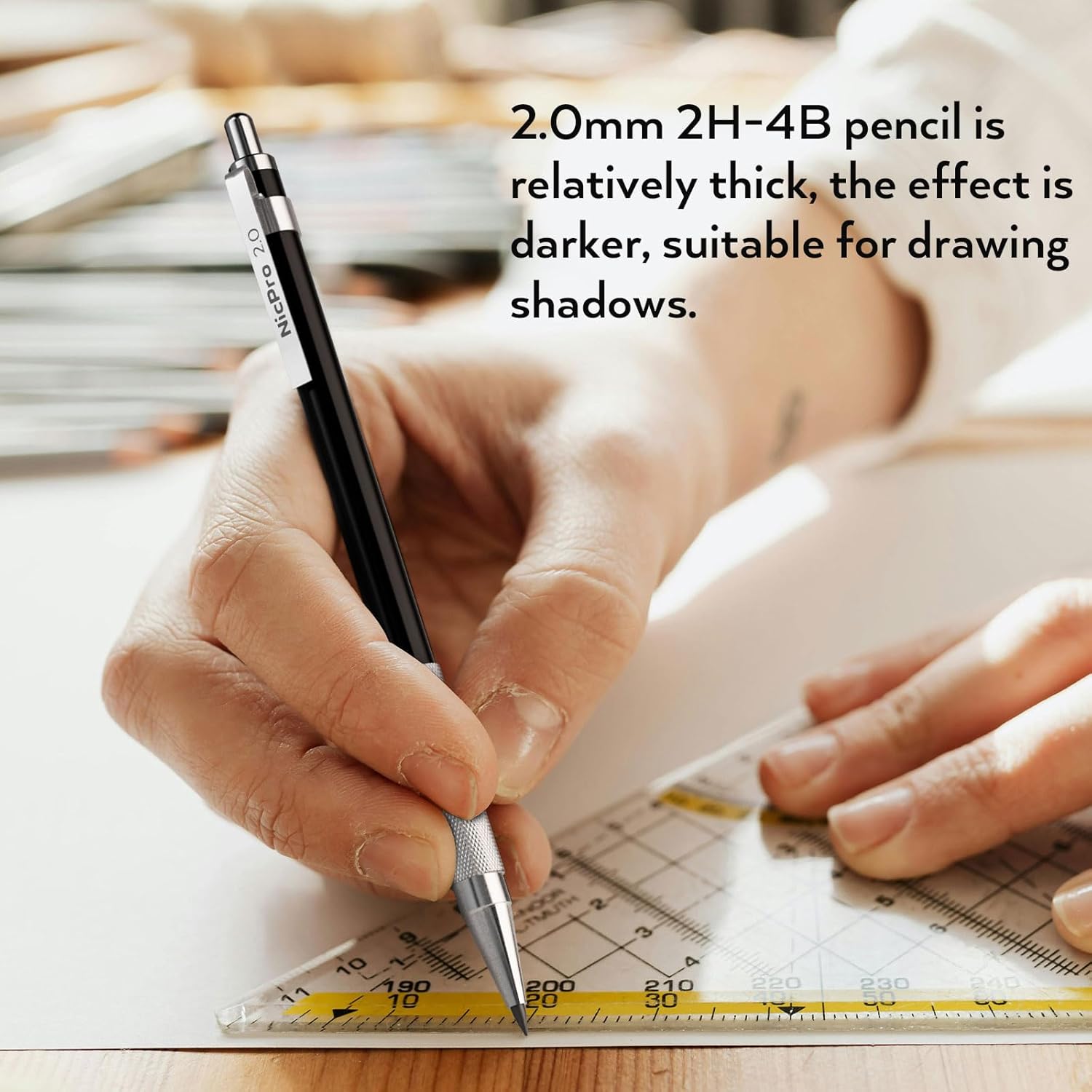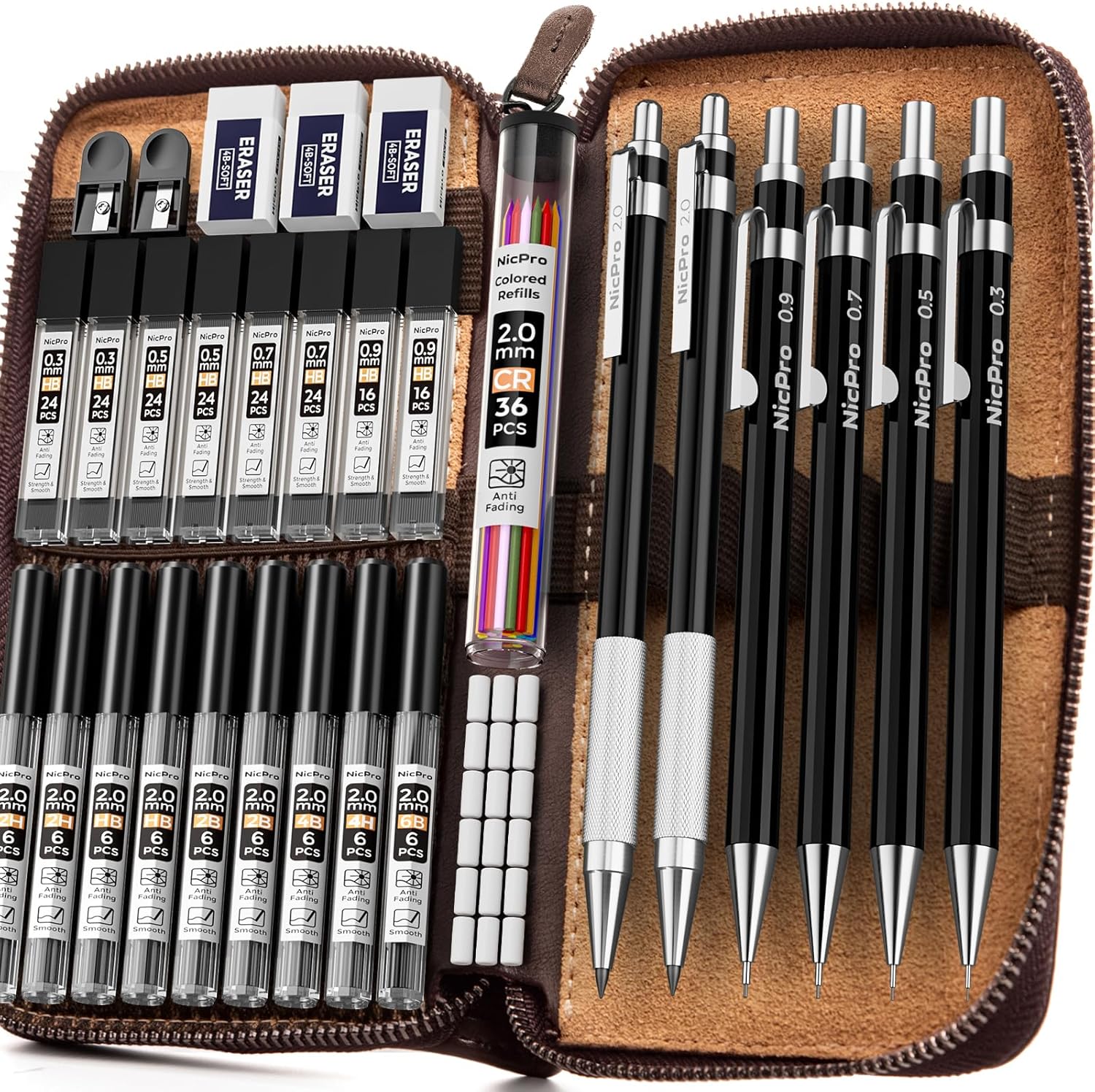 - 1. Awesome Artist Set 33PCS:Nicpro drawing mechanical pencil set comes with 6pcs metal mechanical pencils in 0.3mm,0.5mm, 0.7mm, 0.9mm and 2.0 mm , each sized a different line width for a variety of sketching techniques. 4B soft erasers and mini cap eraser refills are included,cleanly and completely removes graphite markings from paper