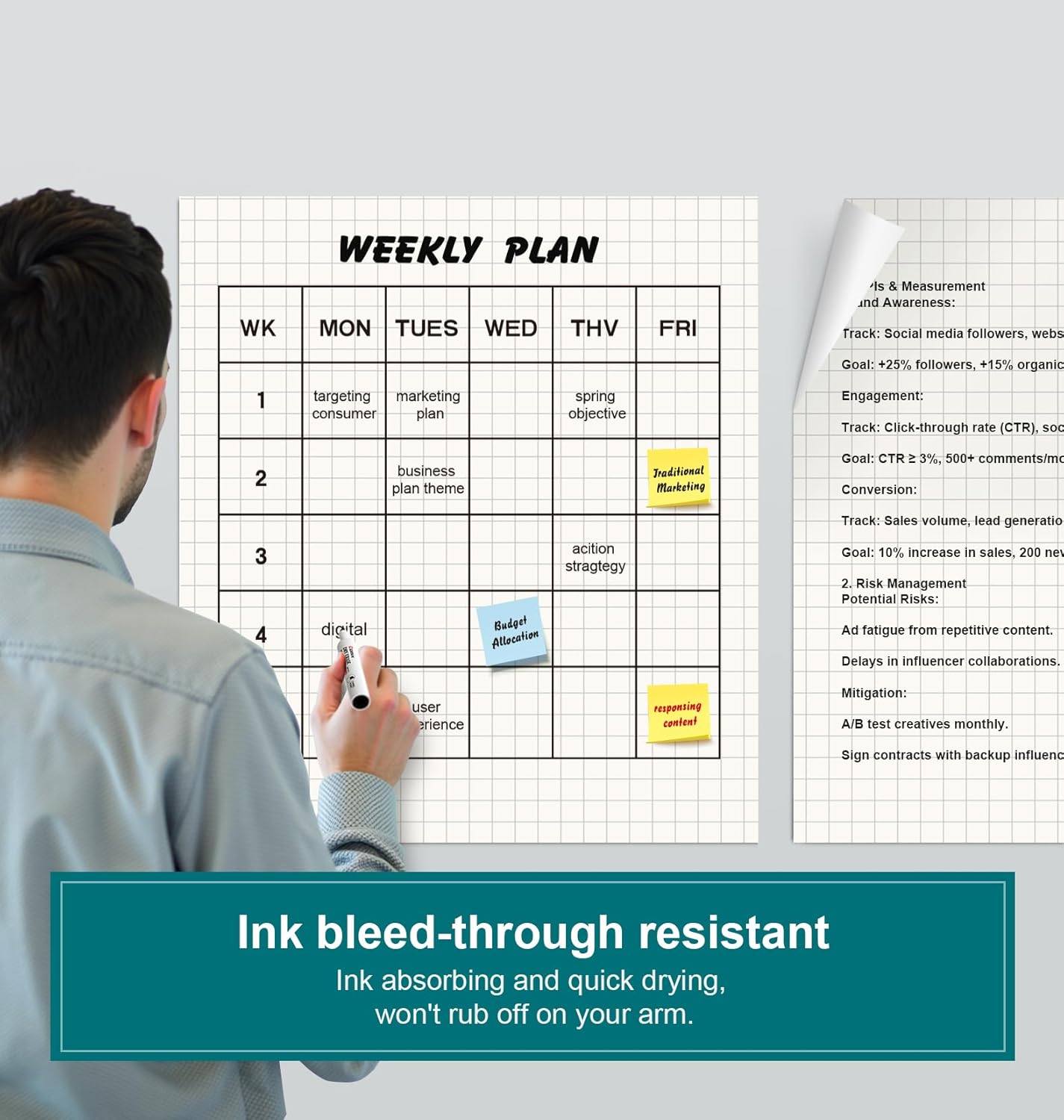 - 【Ink Bleed-Through Resistance】The large sticky notes paper can resist bleed-through from markers or pens, ensuring that your notes and ideas stay clear and easy to read