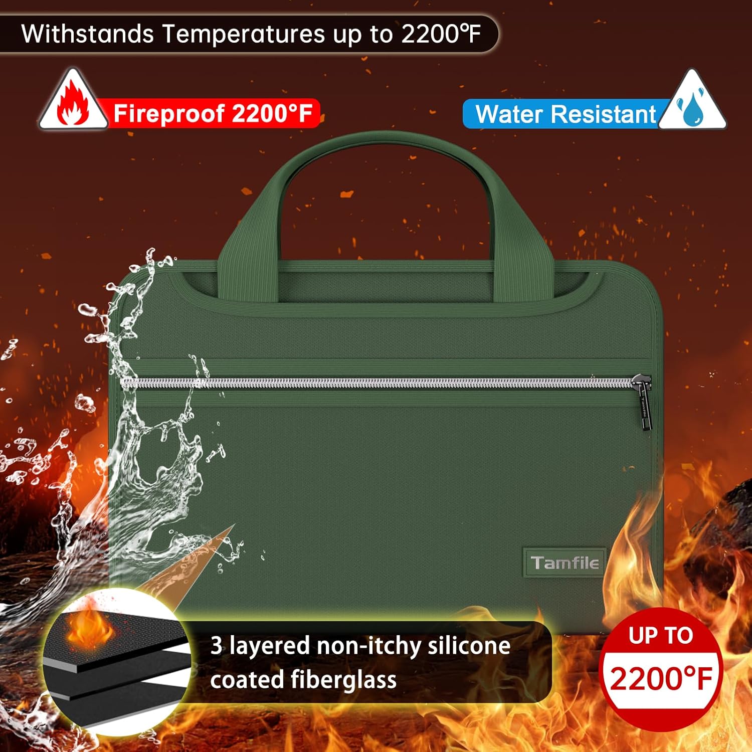 - Tamfile Fireproof Storage Folder: Fireproof, Waterproof, Dustproof. The folder surface is made of upgraded silicone glass fiber fabric with fireproof and waterproof properties, capable of withstanding temperatures up to 2200°F and passing SGS testing (UL94 certification).Fireproof multifunctional folders are suitable for storing and organizing your valuable materials certificates, birth certificates, important documents, office supplies, picture albums, drafts, etc.