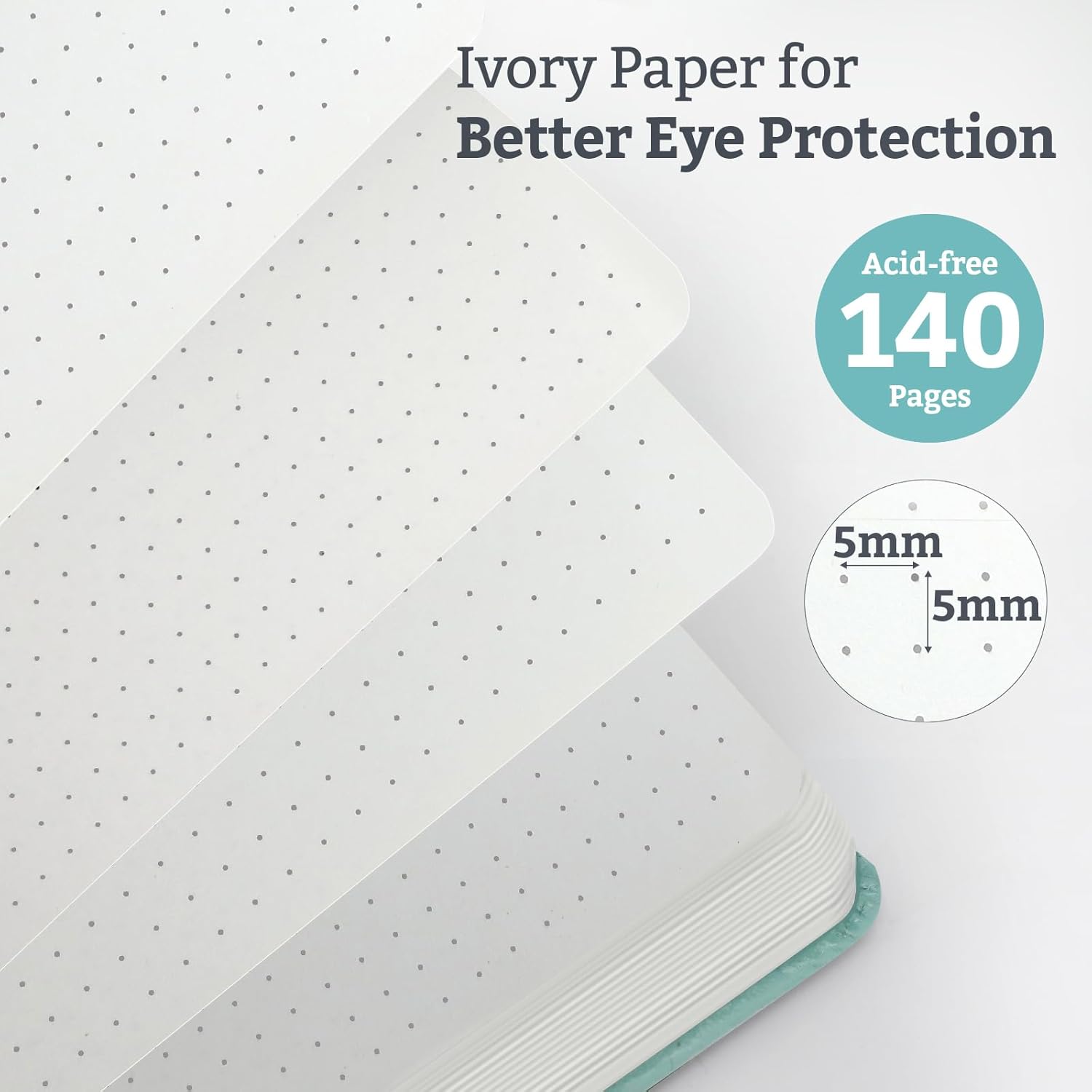 - Dotted Pages (2-Pack): Each notebook features 140 pages (70 sheets) of dotted, 120gsm acid-free paper resists bleeding and ghosting, compatible with most pens. Ivory hue eases eye strain.