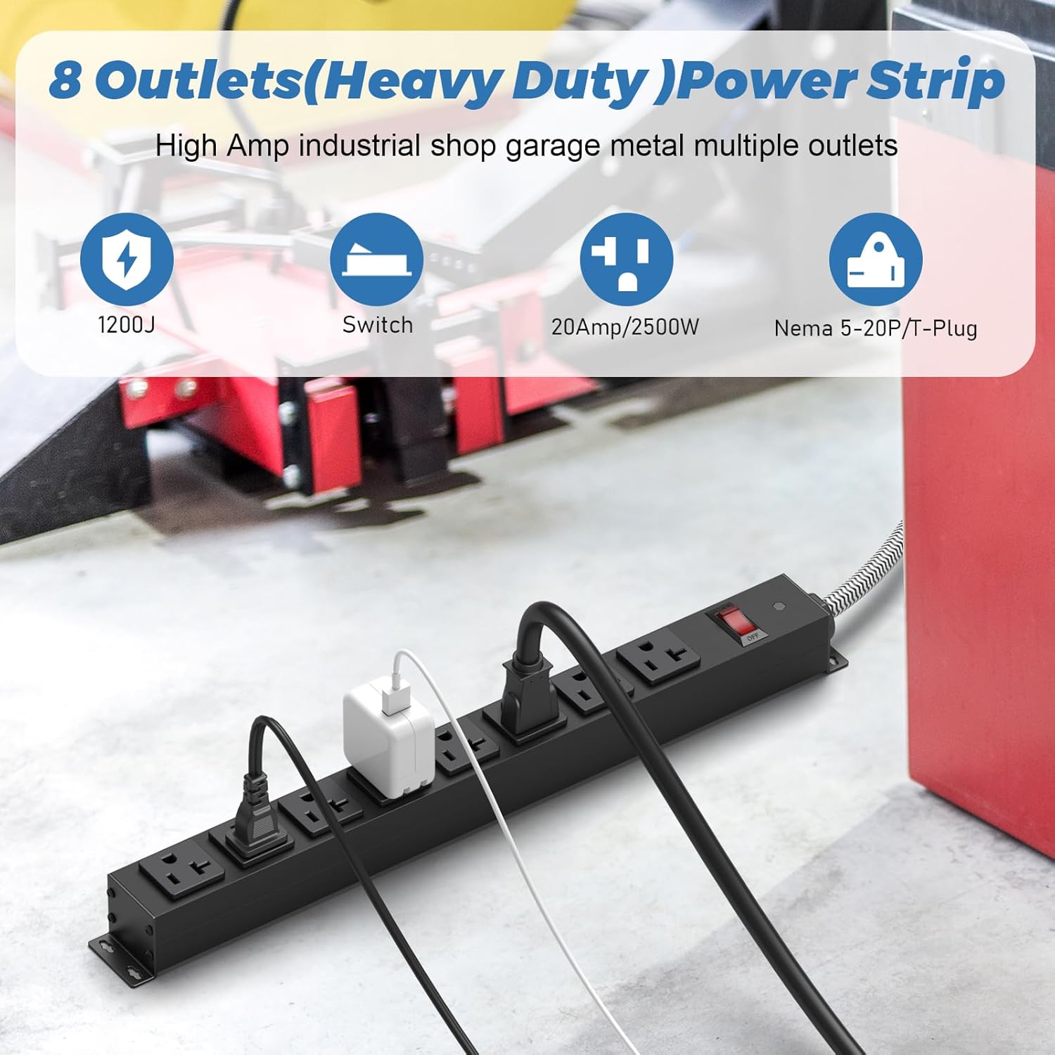 HEZI 20 Amp Power Strip Surge Protector 1200J, Metal 8 Outlets Heavy Duty 20amp, 15Ft 12 Gauge Extension Cord for Appliance Workbench Garage Industrial, Combine with T-Plug Adapter,5-20R T-Slot
